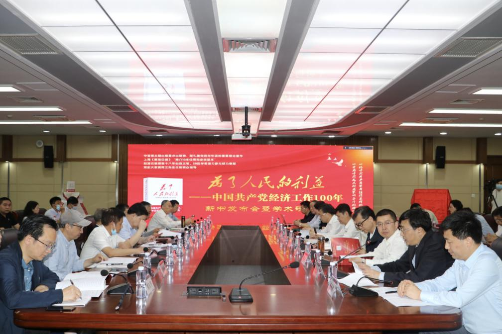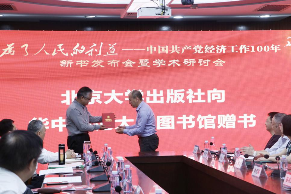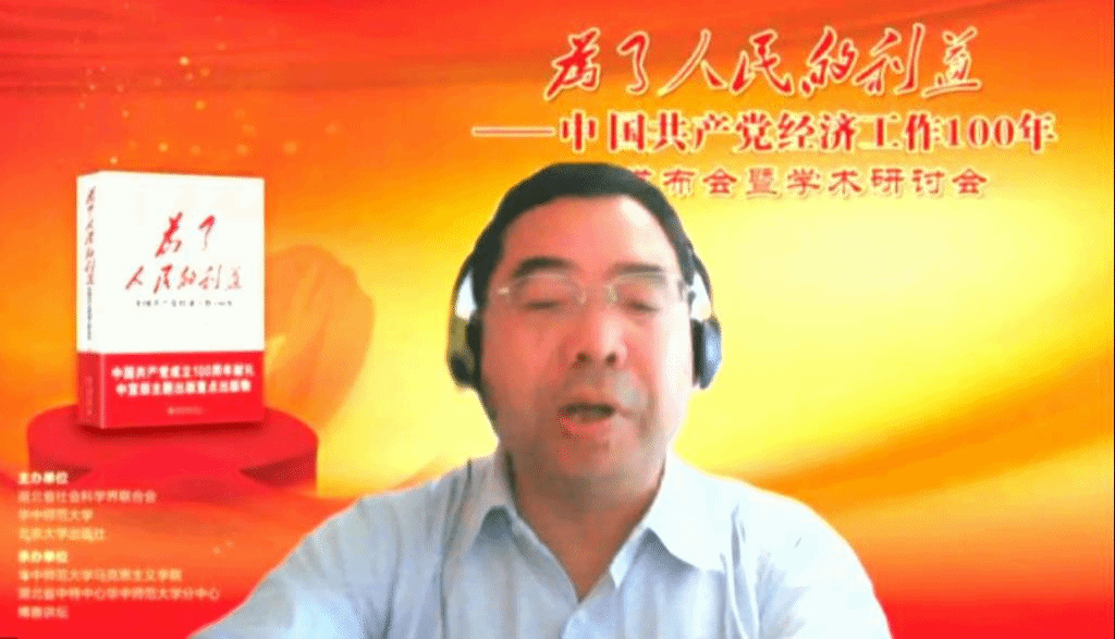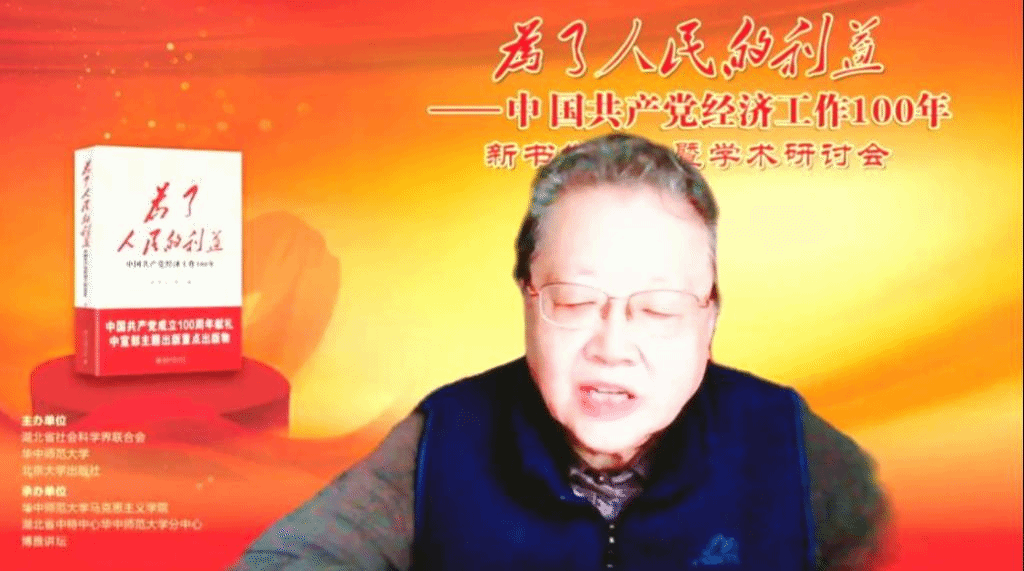 马克思主义学院讯(通讯员 郭蓉 刘婷 覃施颖;摄影 覃施颖 邱佳乐)5月15日,由湖北省社会科学界联合会、华中师范大学和北京大学出版社主办,华中师范大学马克思主义学院、湖北省中国特色社会主义研究中心华中师大分中心、北京大学出版社博雅讲坛承办的《为了人民的利益——中国共产党经济工作100年》新书发布会暨学术研讨会在我校逸夫国际会议中心二楼会议室顺利召开。此次会议以“中国共产党经济工作100年”为主题,分新书发布会和学术研讨会两个环节进行,采取线下+云端的方式,华中师范大学云会堂和北京大学出版社博雅讲坛同步直播。来自中共湖北省委宣传部、湖北省社会科学界联合会、中国社会科学院、中央党史和文献研究院、北京大学、南京大学、华中科技大学、中央财经大学、中国地质大学(武汉)、中南财经政法大学、湖北大学、南昌师范学院、湖北省新华书店(集团)有限公司等社会各界的60余位领导、专家、学者及编辑出席。