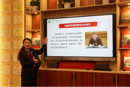 在学院丁琳老师的讲解引导下,专家组一行首先参观了学院大厅和文化长廊,了解学院的发展历史。在马克思主义学院一楼教师成果陈列室,副院长李芳以《打造三维教学共同体,推动思政课提质增效》为主题,从加强党的领导、落实主体责任、打造三维共同体(师—师共研体、师—生教研体、生—生学习共同体)等方面介绍思政课教学改革的举措以及所取得的成效。
