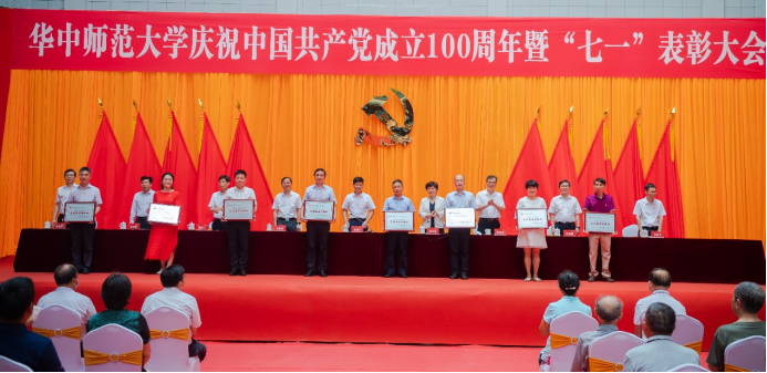 马克思主义学院讯 (通讯员:段海菁 王海龙)6月29日,华中师范大学庆祝中国共产党成立100周年暨“七一”表彰大会在佑铭体育馆隆重举行。本次大会对全校优秀共产党员、优秀党务工作者和先进基层党组织进行了表彰,为“光荣在党50年”老党员颁发纪念章。我院党委获评“先进分党委”;退休党支部刘松阳、陈震东作为“光荣在党50年”代表参加会议接受纪念章;教工龙静云、徐秉国、王海龙,学生陈陈瑾获评“优秀共产党员”称号;孙永祥、邵莉莉获评“优秀党务工作者”称号;思想道德与法治教育教研部党支部、马克思主义基本原理教研部党支部、硕士研究生2019级思想政治教育党支部获评“先进党支部”。