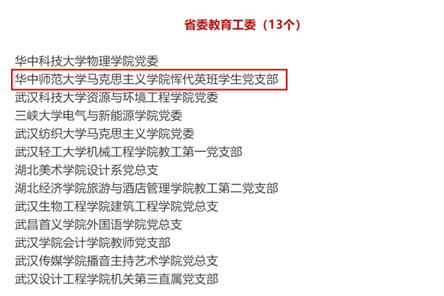 经中共湖北省委决定,在中国共产党成立100周年之际,表彰一批全省优秀共产党员、全省优秀党务工作者和全省先进基层党组织。根据评选表彰工作部署,在各市、州、直管市、神农架林区党委和省直有关工委(党委)提出推荐对象的基础上,经过认真审核遴选,确定了360个全省先进基层党组织作为表彰对象,其中由省委教育工委系统推荐,我院恽代英班学生党支部获表彰。