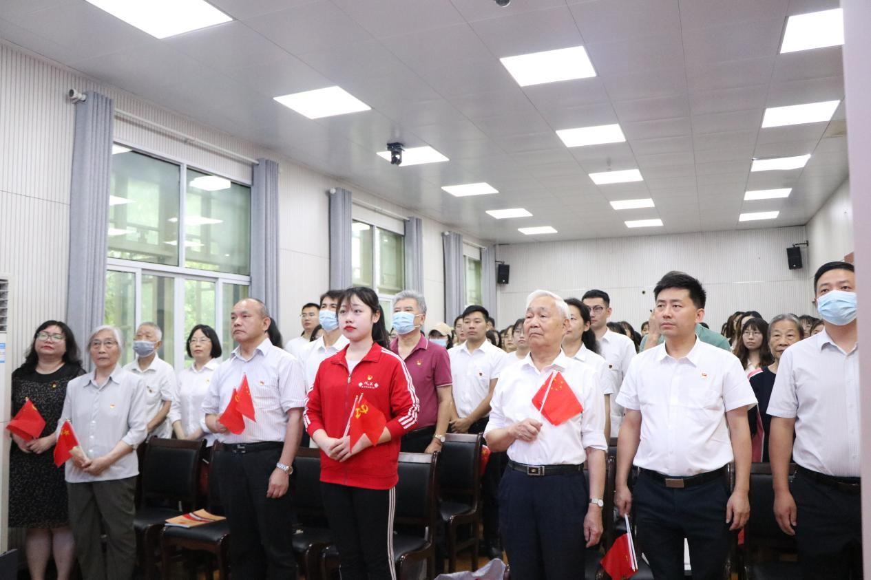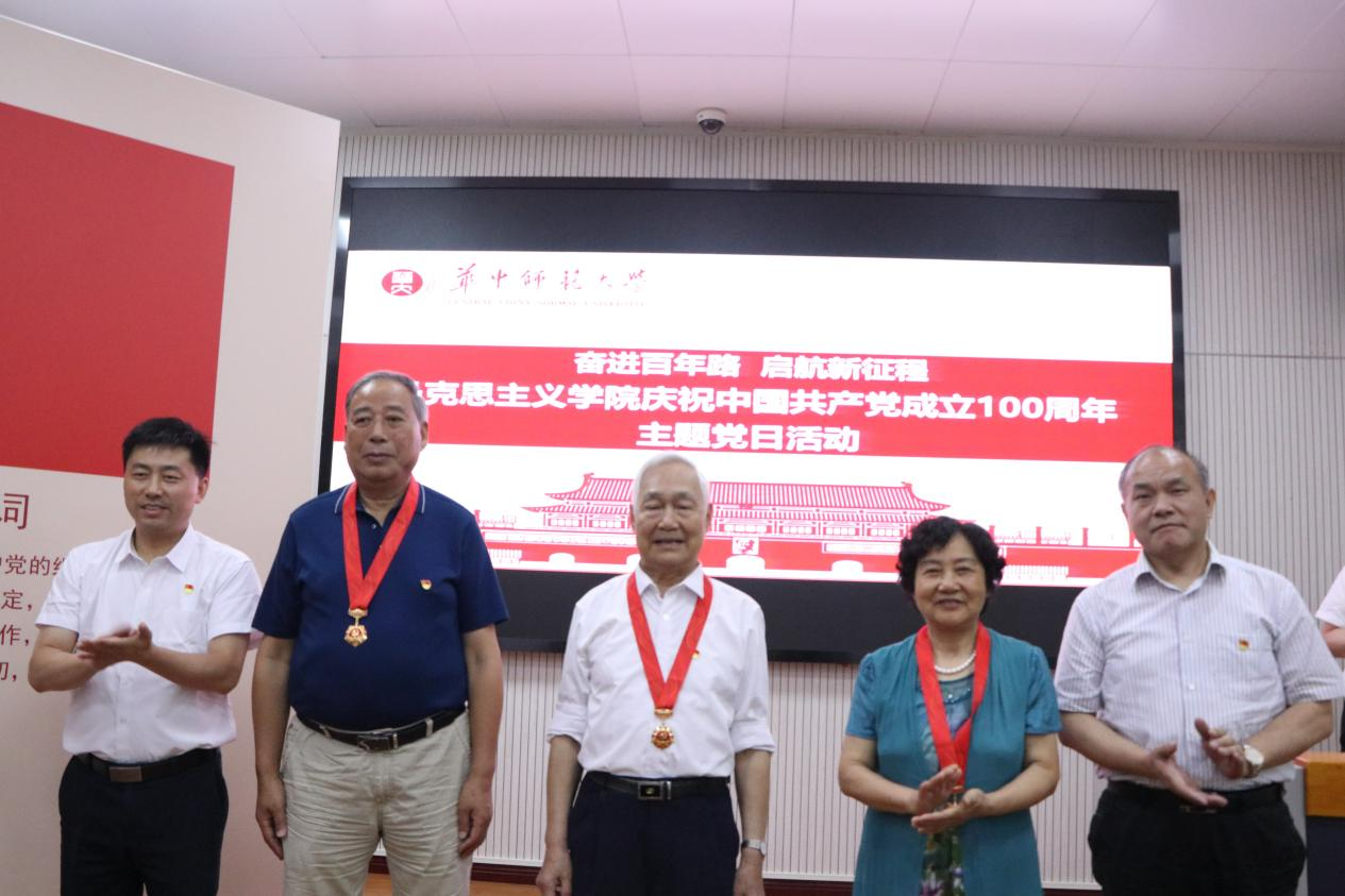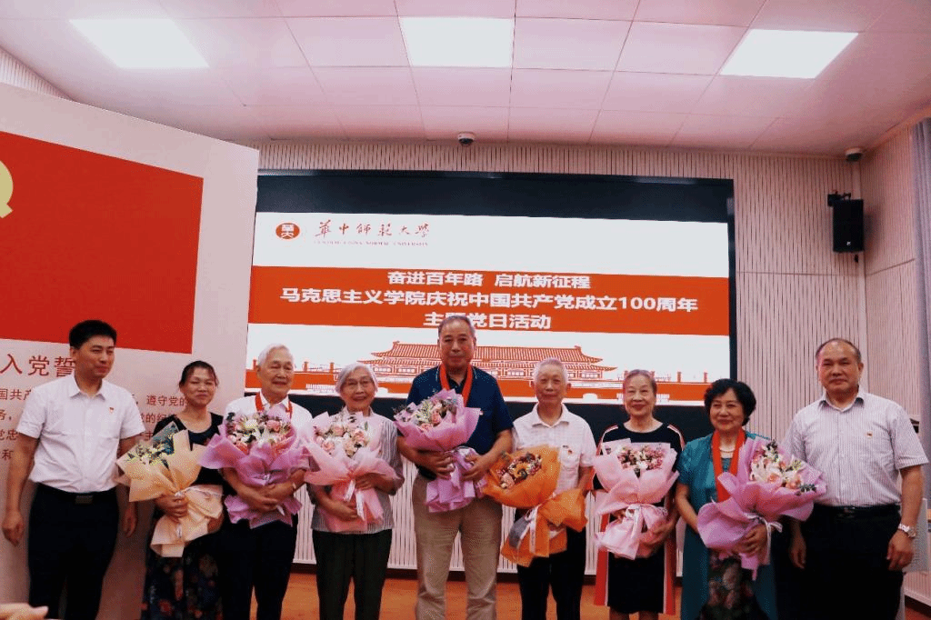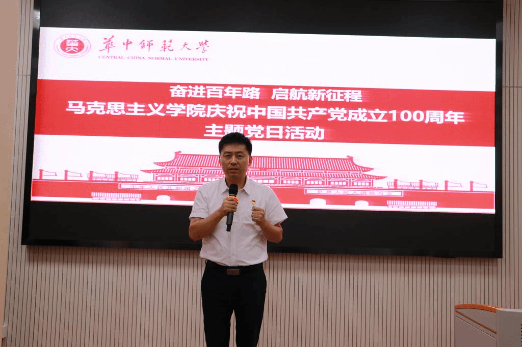 马克思主义学院讯(通讯员:陈梦佳;摄影:郭蓉)7月1日上午,华中师范大学马克思主义学院庆祝中国共产党成立100周年主题党日活动在一号教学楼三楼学术报告厅举行。华中师范大学马克思主义学院党委书记孙永祥、院长、党委副书记万美容以及学院全体党委委员、党政联席会议成员、“光荣在党50年”老党员代表、退休党支部党员代表、2021年新入党师生党员等共计130人参加活动,每人手执党旗和国旗参加活动。活动由正处职组织员董俊敏主持。