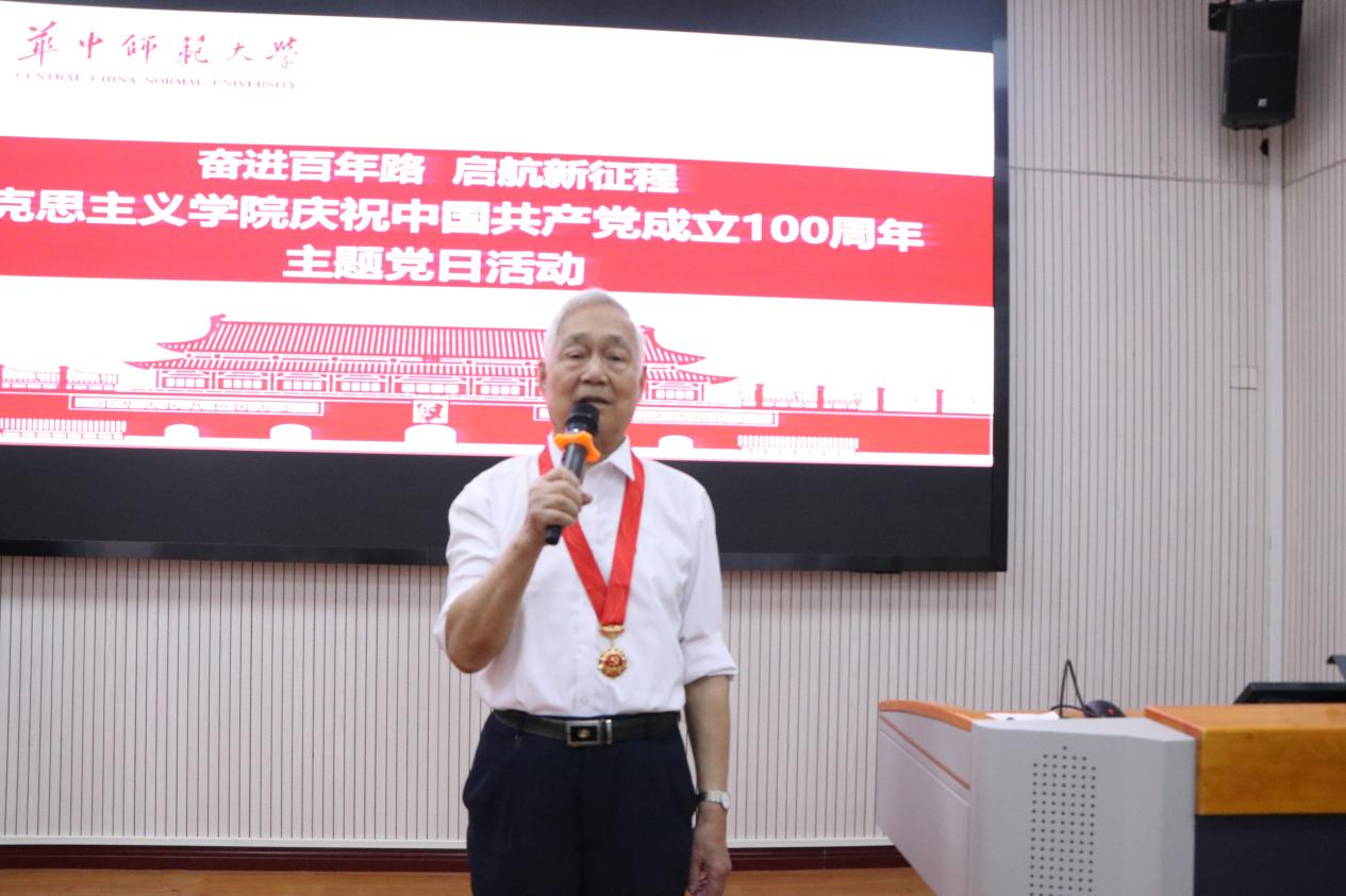 庆祝中国共产党成立100周年大会结束后,我们进入主题党日活动第二项议程。孙永祥和万美容共同为“光荣在党50年”老党员代表张耀灿、郭圣福、董传凤等颁发纪念章并敬献鲜花,表达了学院全体党员对老党员同志的敬意。张耀灿教授表示:“今天,我的心情非常激动。我是在华师大二时入党,今年入党已经65年。作为一名老党员,对党非常热爱。”