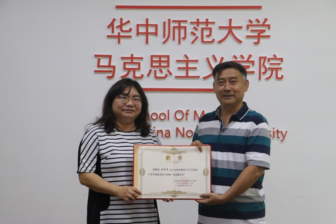 马克思主义学院党委副书记邵莉莉为刘粵平先生颁发马克思主义学院校友育人导师“荣誉辅导员”聘书。