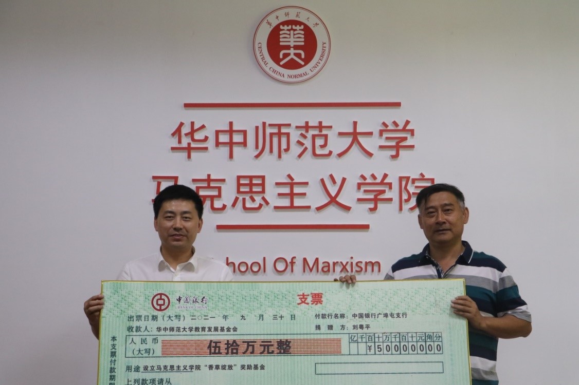 马克思主义学院讯(通讯员 吴宇凡 邱佳乐 王海龙;摄影 董超 许静)9月30日上午, 马克思主义学院“香草绽放”奖励基金捐赠仪式在1号楼二楼会议室举行。马克思主义学院1980级校友刘粤平先生与夫人聂静女士(同为我院80级校友)以个人名义捐款人民币50万元,设立“香草绽放”奖励基金。我院1980级校友刘粤平先生出席,华中师范大学副校长彭南生、学校校友工作与合作发展办公室主任王志彬、副主任李方红,马克思主义学院党委书记孙永祥、院长万美容、正处职组织员董俊敏、党委副书记邵莉莉、副院长李芳、毛华兵、邵彦涛,马克思主义学院教授代表胡田庚、谢从高及校友办涂睿等参加本次捐赠仪式。捐赠仪式由万美容院长主持。