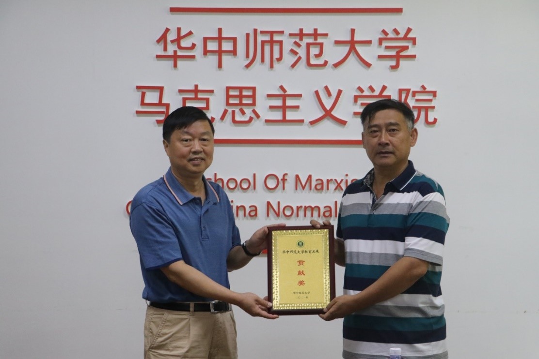 马克思主义学院正处职组织员董俊敏为刘粵平先生颁发基金会捐赠贡献奖奖牌。