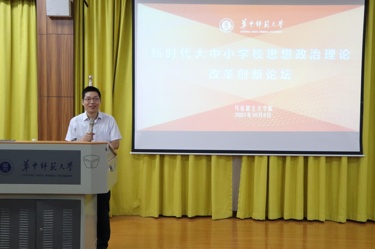 马克思主义学院讯(通讯员 张志庭;摄影 徐婷婷)10月4日上午,为厚植教育情怀,扎根基础教育,培养优质师资,提升教育质量,“新时代大中小学校思想政治理论改革创新论坛”在华中师范大学一号教学楼1101教室隆重举行。华中师范大学马克思主义学院院长万美容、副院长邵彦涛、副院长李芳以及众多毕业于华中师范大学马克思主义学院(包括本科、双学位、硕士、博士等,涵盖政治系、政治教育系、法商学院、政法学院、理论课部、马克思主义学院等)、工作在基础教育一线的中小学教师和教育教学管理人员参加论坛活动。论坛由胡田庚教授主持。