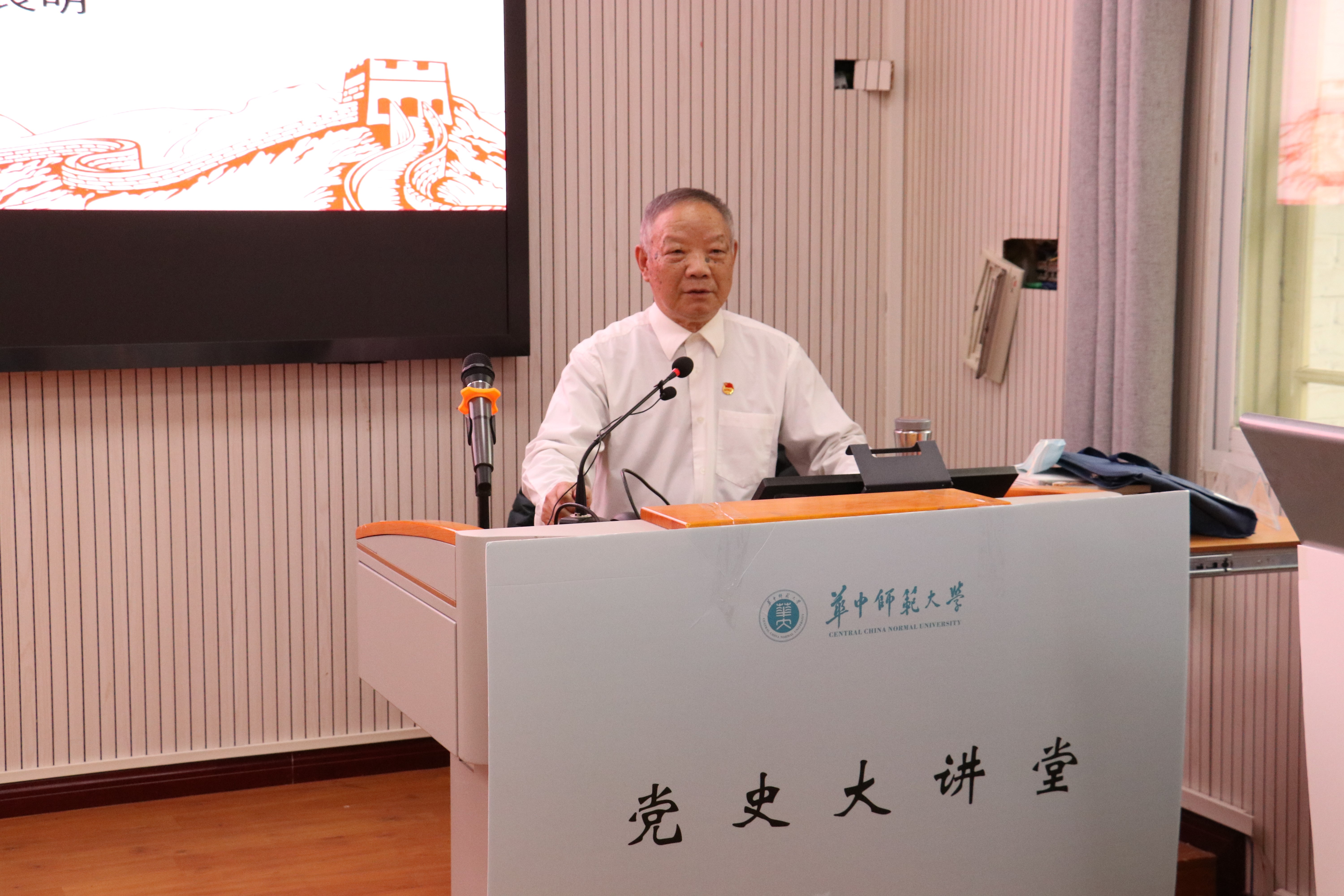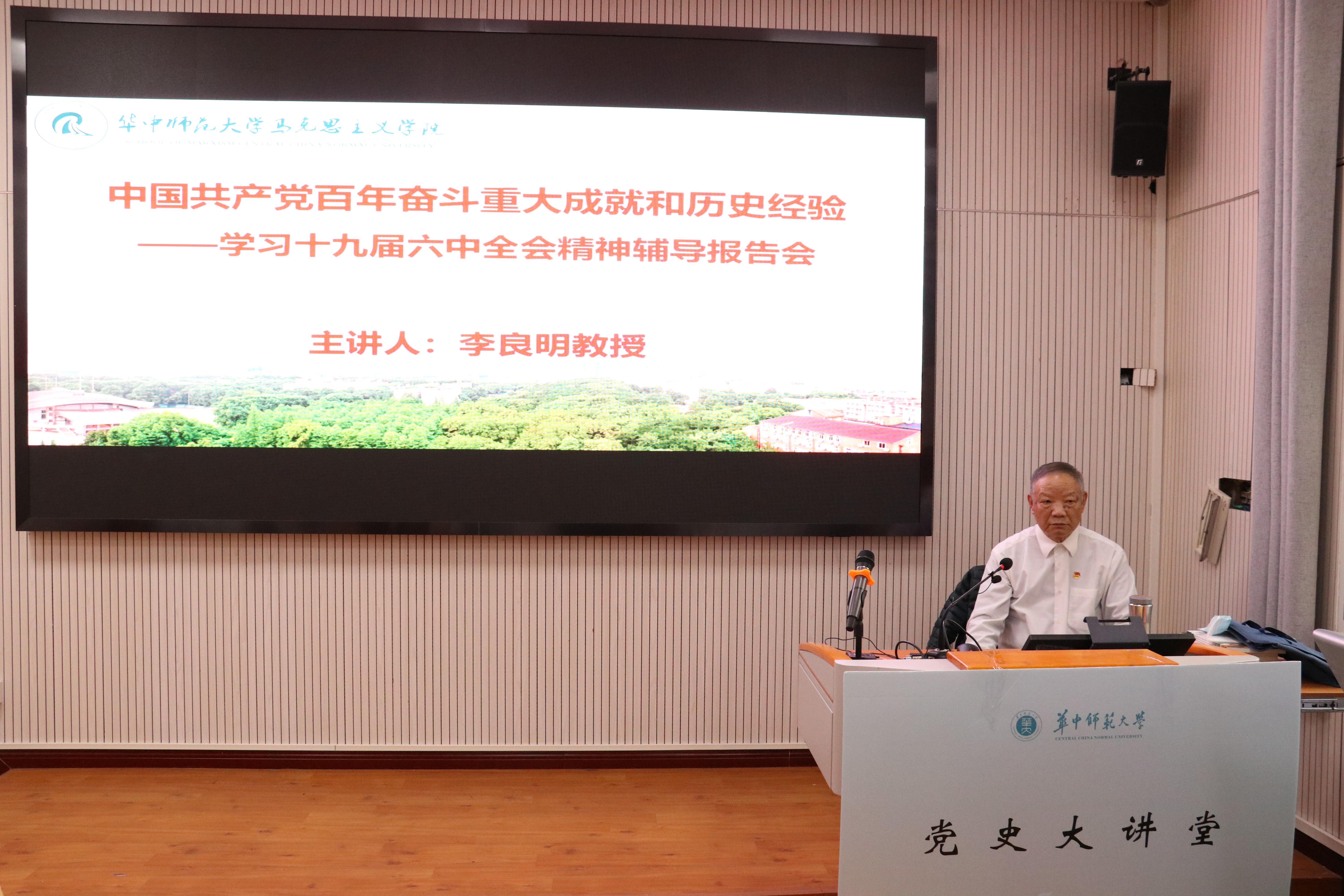 马克思主义学院讯(通讯员 王海龙;摄影 吴宇凡)11月12日下午,华中师范大学党史大讲堂暨马克思主义学院第八期“党委引航讲坛”在1号教学楼三楼学术报告厅举行,华中师范大学桂岳卓越教授、中共党史专家李良明以《中国共产党百年奋斗重大成就和历史经验——学习十九届六中全会决议的初步体会》作专场辅导报告。报告会由马克思主义学院党委书记孙永祥主持。