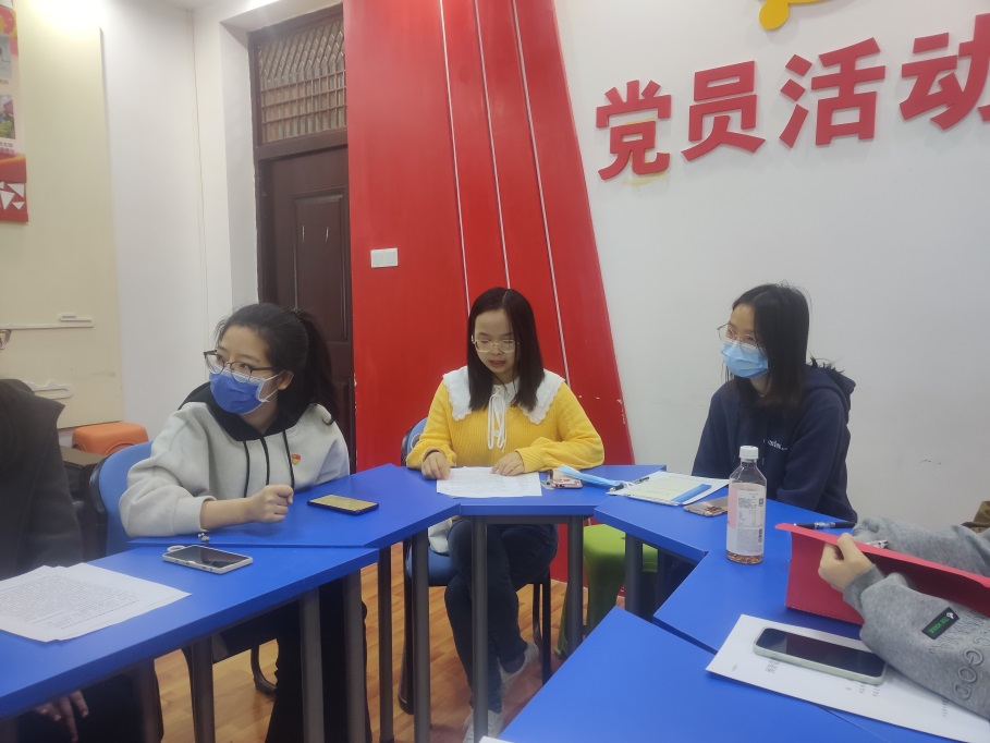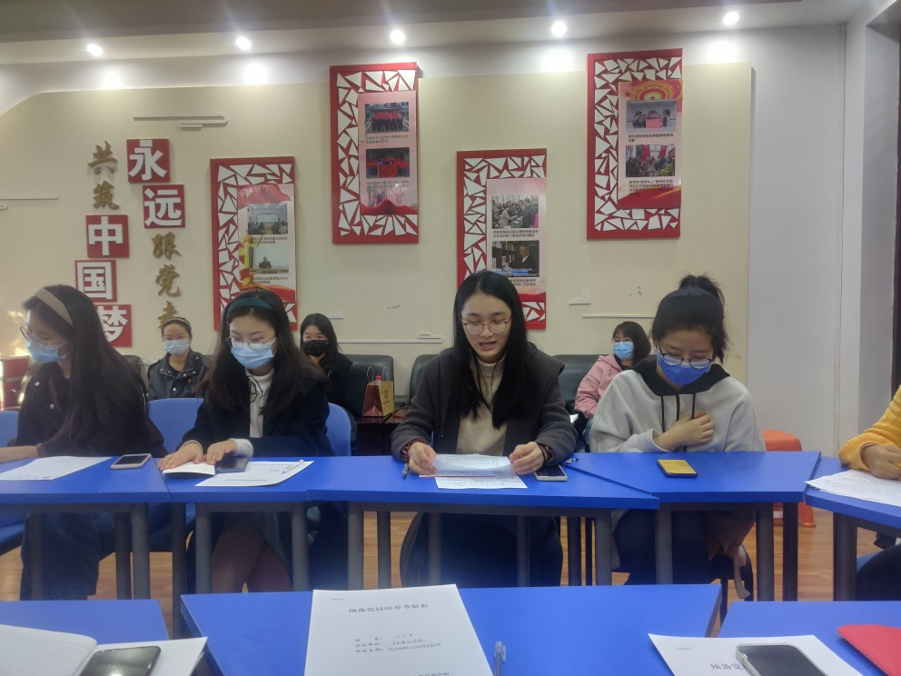 预备党员李永茂同志讲述了自身在过去三年中与病魔作斗争并逐渐回归正常生活的过程。他说,“我从这几年的经历中反思得到,生活中或许会有许多的磨难,但是我们应该要不急不躁,保持革命乐观主义精神,才能最终战胜苦难,走向成功。”作为李永茂同志入党介绍人,房志敏同志肯定李永茂同志在生活中热心助人,同时自身素养较高,但是在面对压力和焦虑的时候也要注意自我调节,放平心态。预备党员何楚烨同志分享了自己在社会实践上的心得与成果,讲述自己过去一年通过寄信,给边远地区的孩子送去了祝福,坚定了他们对生活的信念。入党介绍人陈黛同志评价说“何楚烨同志有爱心且细心,但是在平衡学习和休闲方面还需要继续努力。”