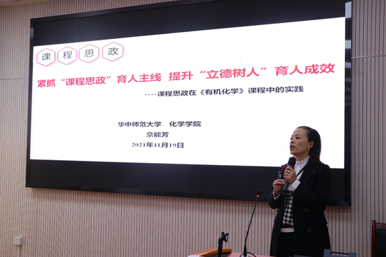 在课程思政建设经验分享中,化学学院佘能芳教授以“紧抓‘课程思政’育人主线,提升‘立德树人’育人成效”为主题进行了一场精彩的经验分享。佘教授从践行课程思政的背景出发,指出在“大思政”格局之下,教育是一个立德树人的过程,要抓住专业教师主力军、专业课程主阵地、专业学习主渠道,结合学校人才培养目标、院系培养目标、课程目标将育人与育才相结合。佘教授从践行思路与过程、教学内容、案例分享、践行效果、心得体会五个方面,分享了自己的教学经验与总结体会。