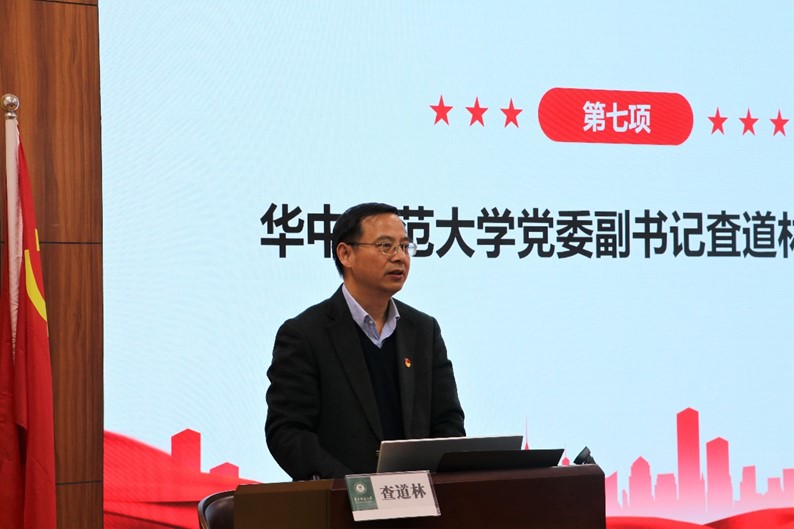 华中师范大学党委副书记查道林对整场活动进行总结讲话,并就如何推动基层党建工作的开展,提出三条建议:一是筑牢政治根基,牢记政治使命,进行全面学习,加强党性修养;二是创新基层党组织建设,结合学生实际,建立起“校内”与“校外”的联合,丰富支部活动的内容与形式;三是擦亮华师红色底色,传承恽代英红色血脉,充分发挥马院恽代英班学生党支部的辐射带动作用,努力打造“一支部、一特色、一品牌”。