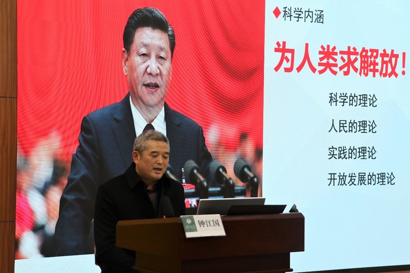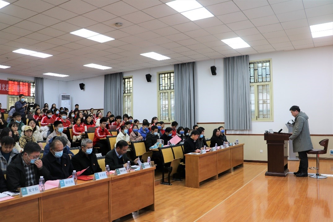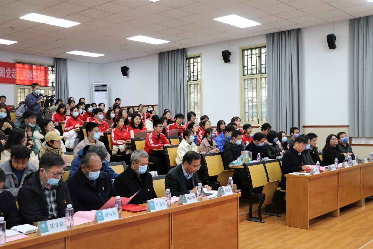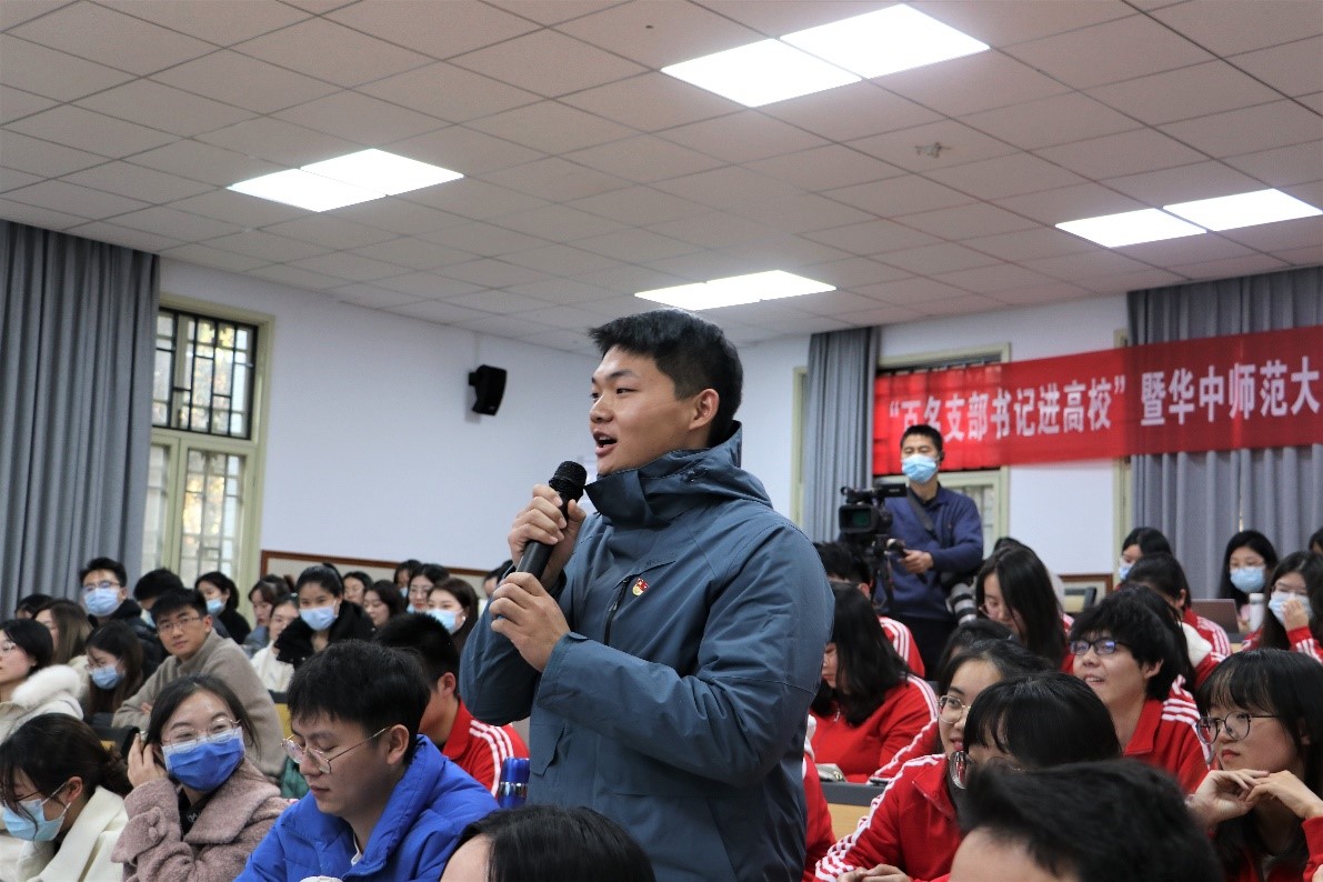 马克思主义学院讯 (通讯员:陈晨 王海龙; 摄影:张志庭)为学习贯彻十九届六中全会精神,推动习近平新时代中国特色社会主义思想入脑入心,加强学生党支部思想政治建设,12月17日下午,湖北省“百名支部书记进高校”暨华中师范大学“永远跟党走”主题党日活动于华中师范大学马克思主义学院1101报告厅举行。
