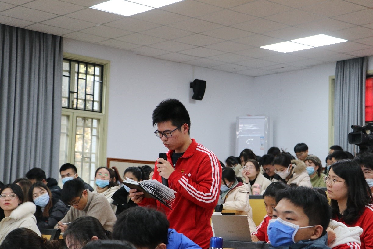 在报告过程中,钟江国首先对党的十九届六中全会进行了讲解。他从“救国、立国、富国、强国”四个历史阶段,简要回顾了党的百年历史与建党精神,阐释了《中共中央关于党的百年奋斗重大成就和历史经验的决议》中的十条经验,以及党百年奋斗的重要意义。之后,结合自身工作实际,钟江国介绍了我国航天事业发展的基本情况以及其所在的中国航天三江集团的发展历程。“干惊天动地事,做隐姓埋名人”。提起三江集团的历史,他动情的讲述了三江前身——066基地在发展过程中孕育形成的“团结争气、艰苦创业、求实自强、改革创新”的066精神,即现在的三江精神。他指出,这一精神始终激励着三江人牢记使命初心,忘我投身航天工作,为国家建设做出更大贡献。之后,就“如何在基层宣传好马克思主义”,钟江国以自己在工作中遇到的实际问题为例,分享了自己的思政工作经验,并结合中华优秀传统文化、经典故事等,提出“尽天性”、“修心性”、“讲道德”,用马克思主义指导工作和生活。最后,钟江国寄语在场大学生“勿忘昨天的苦难辉煌,无愧今天的使命担当”,激励同学们为实现中华民族伟大复兴的中国梦而不懈奋斗。