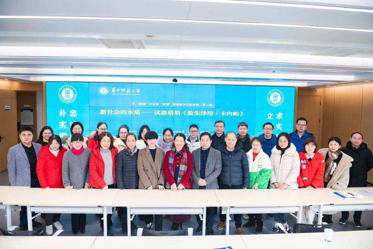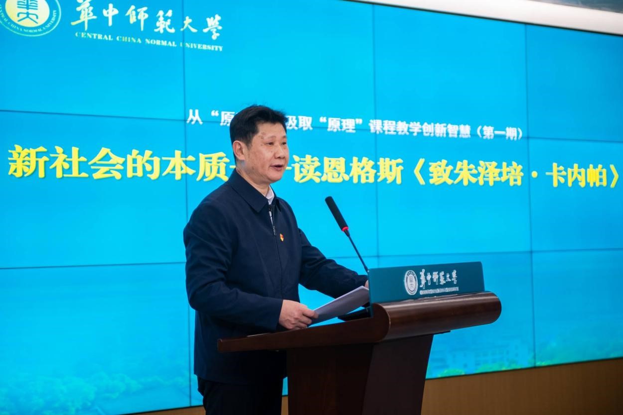 马克思主义学院讯(通讯员 周万全 闫燕)1月16日上午,由教育部社科司、湖北省委教育工委、湖北省教育厅指导,全国高校“马克思主义基本原理”教学创新中心(以下简称“创新中心”)、全国高校思政课“手拉手”集体备课中心(华中师范大学)、“同课异构·协同共研”思政课教学创新联盟秘书处和华中师范大学马克思主义学院共同主办的“从‘原著’中汲取‘原理’课程教学创新智慧”(第一期)活动通过线上线下相结合的方式成功举行。“创新中心”负责人、华中师范大学党委书记赵凌云教授结合“马克思主义基本原理”课教材作了《新社会的本质规定——读恩格斯〈致朱泽培·卡内帕〉》导读,“创新中心”第二负责人、华中师范大学马克思主义学院马克思主义基本原理教研部部长丁茜主持了本次活动。活动采取线上线下相结合的方式进行,5000多名思政课教师线上同步参与,空军预警学院、中华女子学院、华中师范大学、中南民族大学、安徽大学、湖北大学、广东药科大学、广西中医药大学、云南农业大学、安徽工业大学、沈阳理工大学等100多所高校将本期活动纳入本单位教研活动。