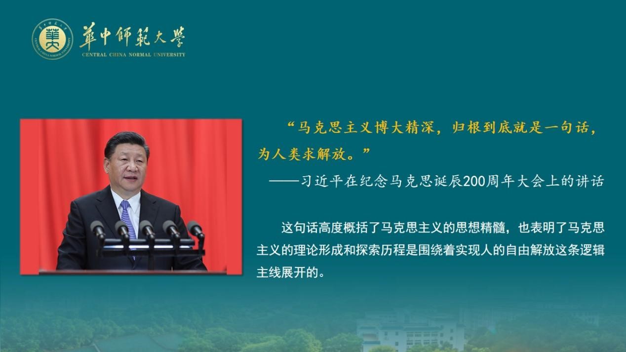 赵凌云书记指出,争取人的彻底解放是马克思主义基本原理课程体系的主线。原理课程紧紧围绕“人的解放”这一主题主线,从四个层面逐次展开:一是要实现人的彻底解放,首先要有解放的思想武器,也就是“解放的头脑”。教材在第一、第二、第三章系统讲授并提供了实现人类解放的思想武器,即第一章揭示了马克思主义世界观、方法论,指明人的解放的客观基础;第二章回归到现实的人类实践,揭示了马克思主义的实践观、认识论和价值论,科学阐明了人类实践的本质及其作用,创立了科学的实践观,指明了人的解放的实践路径;第三章开始探索人类社会历史及其发展规律,指明了人的解放规律。二是要实现人的彻底解放,还要有解放的物质武器,也就是“解放的心脏”。教材第四章揭示了资本主义经济制度的本质及其生产规律,进而分析了资本主义政治制度和意识形态的本质,指明了无产阶级是人类解放的阶级力量;第五章进一步揭示了资本主义的当代发展及其演变趋势,指明当今时代迎来了实现人类解放的新的前景。三是运用思想武器和物质武器,推动人的解放实践过程。对应教材第六章,探索了社会主义的发展及其规律,指明人的解放的实践过程。四是社会主义对人的彻底解放的探索实践正朝着理想目标奋进,对应教材第七章,揭示了共产主义崇高理想及其最终实现,指明了人的解放最终目标实现的历史必然性。