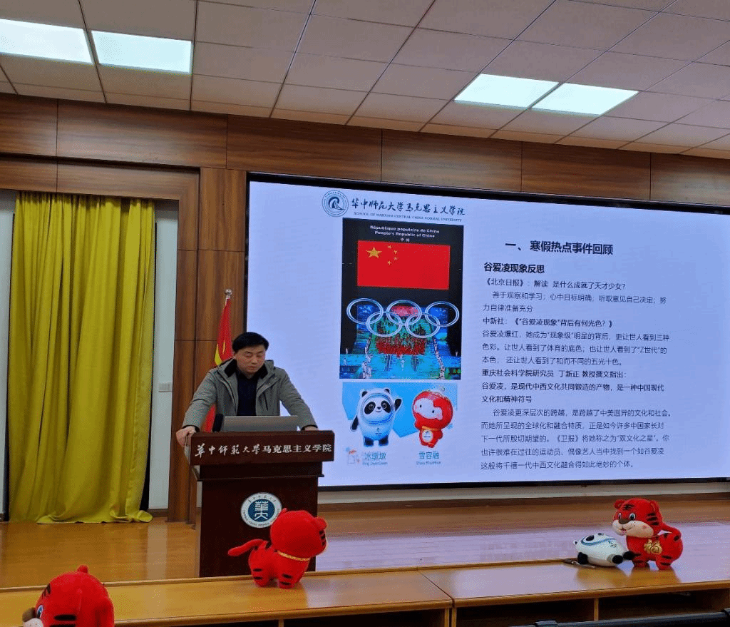 马克思主义学院讯(通讯员 王海龙 张志庭;摄影 张志庭) 冰墩墩、虎公仔,走进1101报告厅,桌面上的摆件吸引了学院老师们,“啊!太温馨啦!”“好有意思!好可爱!” 现场一派喜气洋洋、欢乐祥和。2022年2月20日,马克思主义学院春季开学教职工大会在一号楼1101报告厅召开,学院全体教职工参加。会议由学院党委书记孙永祥主持。
