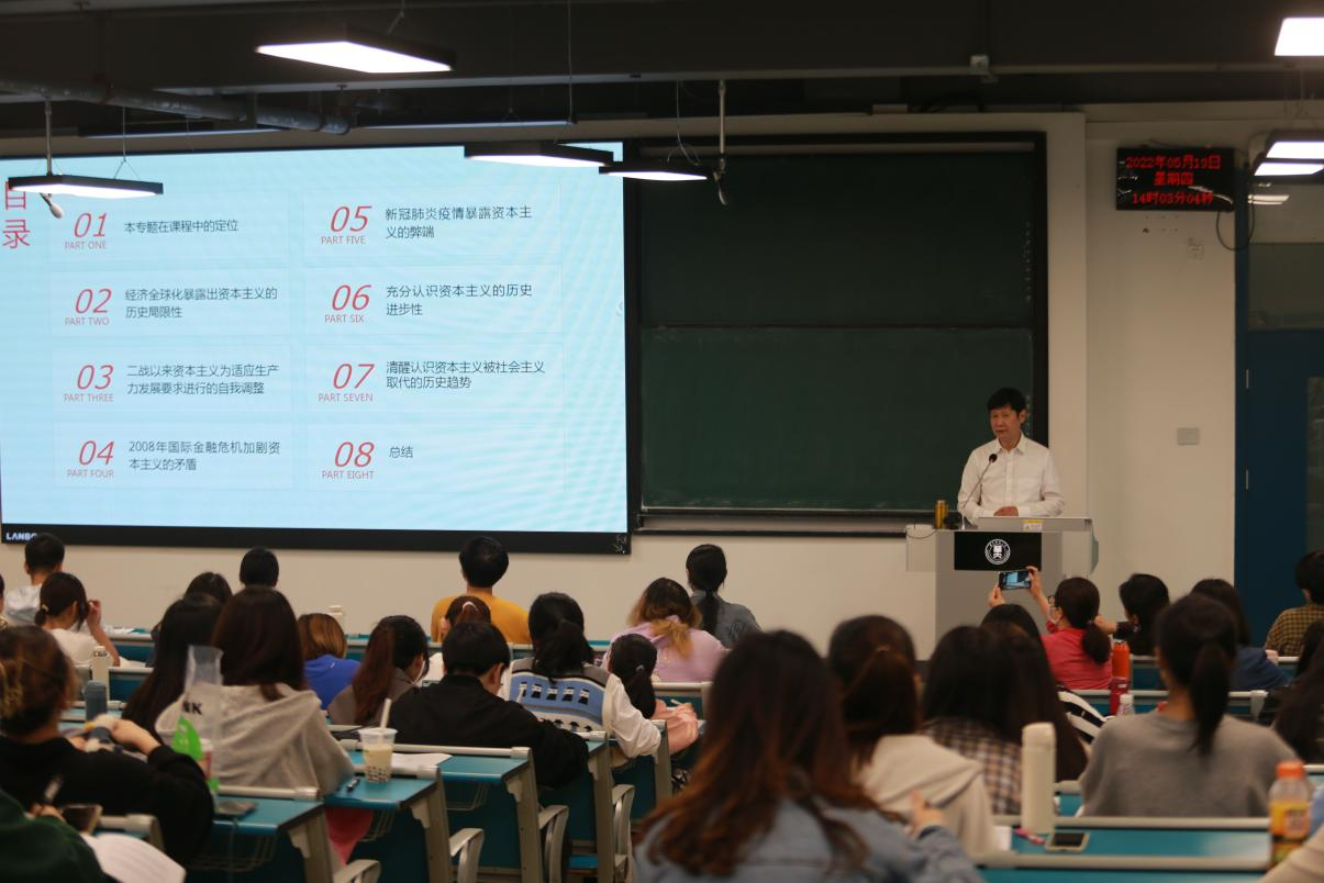 紧接着,赵凌云教授依次从“经济全球化暴露出资本主义的历史局限性”、“‘二战’以来资本主义为适应生产力发展要求进行的自我调整”“2008年国际金融危机加剧资本主义的矛盾”、“新冠肺炎疫情暴露资本主义的弊端”、“充分认识资本主义的历史进步性”、“清醒认识资本主义被社会主义取代的历史趋势”等六个方面进行了系统而深入讲解,赢得了在座师生的阵阵掌声。