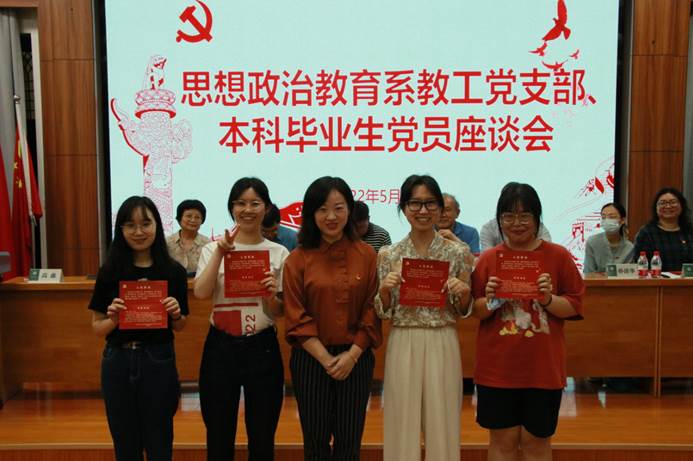 在毕业生党员代表发言环节,思政本科党支部成员柯雨彤从入党初心出发回顾大学生活,表示未来将在教师岗位继续坚守初心、砥砺前行。恽代英班学生党支部副书记童瑶分享了学院教师、党支部对她的帮助,使自己的党性修养和专业素养得以提升。思政本科党支部副书记蔡方结合“挑战杯”获奖经历,向学院及思想政治教育系教工党支部的各位老师表达了谢意,表示未来会继续在实践中提升自我,力争成为优秀的华师马院代言人。