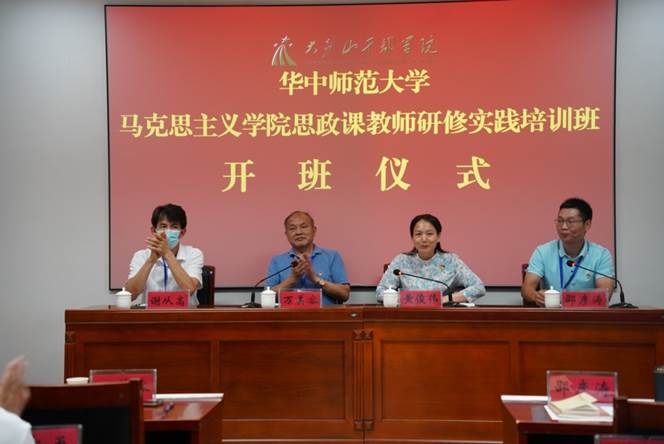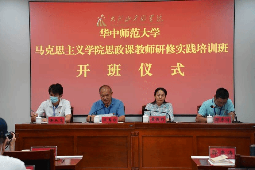 马克思主义学院讯 (通讯员 王海龙 摄影 雷禹 李欣 赵慧 )7月3日下午三点,华中师范大学马克思主义学院思政课教师2022年暑期研修培训班于大别山干部学院顺利开班。大别山干部学院副院长黄俊伟,研修班班主任兰溪,马克思主义学院党委副书记、院长、研修班班长万美容,马克思主义学院副院长、研修班副班长邵彦涛,马克思主义学院工会主席谢从高及马克思主义学院教职工共52人参加开班仪式,会议由邵彦涛主持。