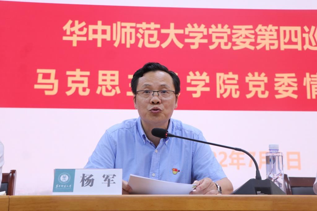 巡察组组长杨军代表巡察组全体成员宣读了《华中师范大学第四巡察组巡察马克思主义学院党委的反馈意见》。一是贯彻落实党的路线方针政策和党中央、教育部党组、湖北省委重大决策部署,以及学校党委决定和要求有差距,主要体现在政治理论学习不够深入,学科专业建设力度不足,落实立德树人根本任务不够到位,意识形态工作存在薄弱环节;二是落实全面从严治党战略部署有不足,主要表现在履行全面从严治党的主体责任不彻底,履行全面从严治党的监督责任有缺失,落实党风廉政建设有短板;三是落实新时代党的组织路线有欠缺,主要体现为学院党委政治保证作用发挥不够充分,基层党建工作不均衡,落实党管人才主体责任不够有力;四是落实巡视、主题教育整改成效不明显,主要体现为领导班子民主生活会问题整改和“不忘初心、牢记使命”主题教育专项整改、党史学习教育“我为师生办实事”方面不够到位,落实一线规则不彻底。
