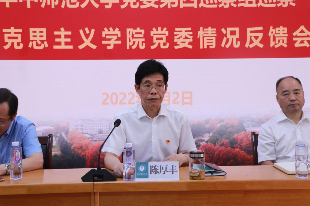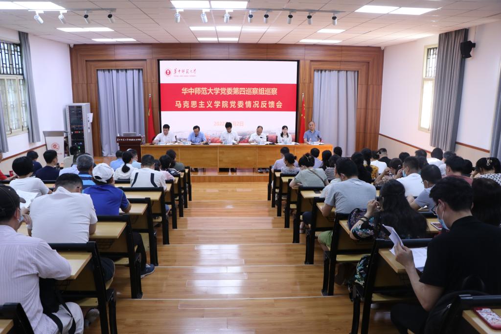 马克思主义学院讯(通讯员:赵婷 马娟)2022年7月2日下午,根据学校党委统一部署,华中师范大学党委第四巡察组巡察马克思主义学院党委情况反馈会在马克思主义学院1101报告厅隆重召开。校党委副书记、纪委书记陈厚丰、巡察办主任王旺胜、学校党委第四巡察组组长、学生工作部副部长、学生事务处处长杨军、学校党委第四巡察组副组长、校友工作办公室副主任易吉林及巡察组员、法学院党委副书记万枞、心理学院党委副书记苏晓刚、财务处胡志荣、研究生院丁宇等出席会议,马克思主义学院党政班子全体成员、全体教职工、退休教职工代表、学生代表等参加会议。会议由马克思主义学院党委副书记、院长万美容主持。