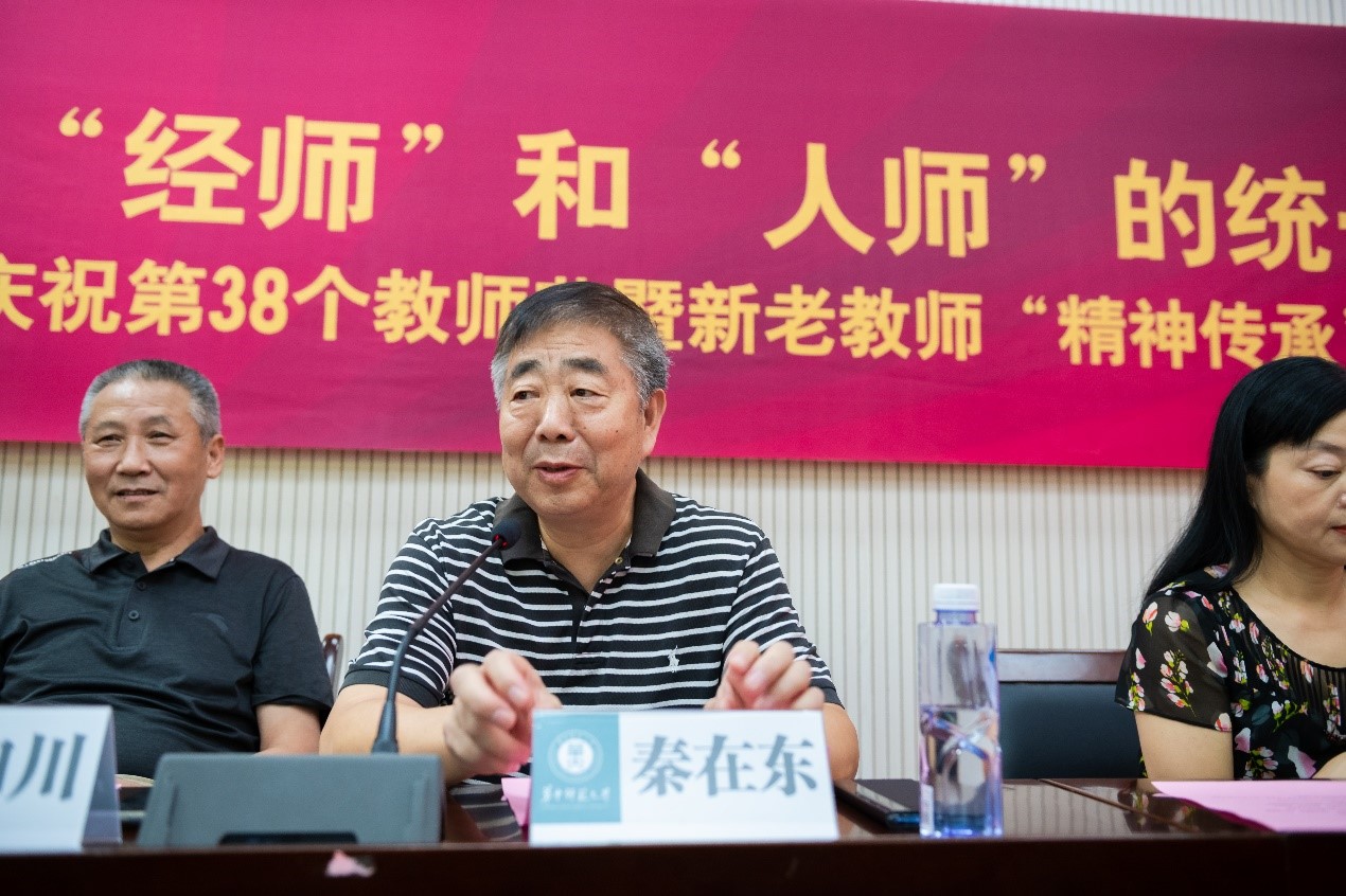 在“精神传承”主旨发言阶段,桂岳卓越教授秦在东教授结合自己暑期开展课题调研的经历,谈到“经师”和“人师”本身就是统一的、融合的,教书育人、为人师表是教师的天职。同时,他就大学教师的特殊历史使命表达了自己的看法,认为,大学教师要能够向学生传授知识,做知识的“摆渡人”;要能和学生一起创造新的知识,做知识的“生产者”;要能训练学生的生存与发展能力、职业能力,提升学生的智慧,做智慧的“点化师”。
