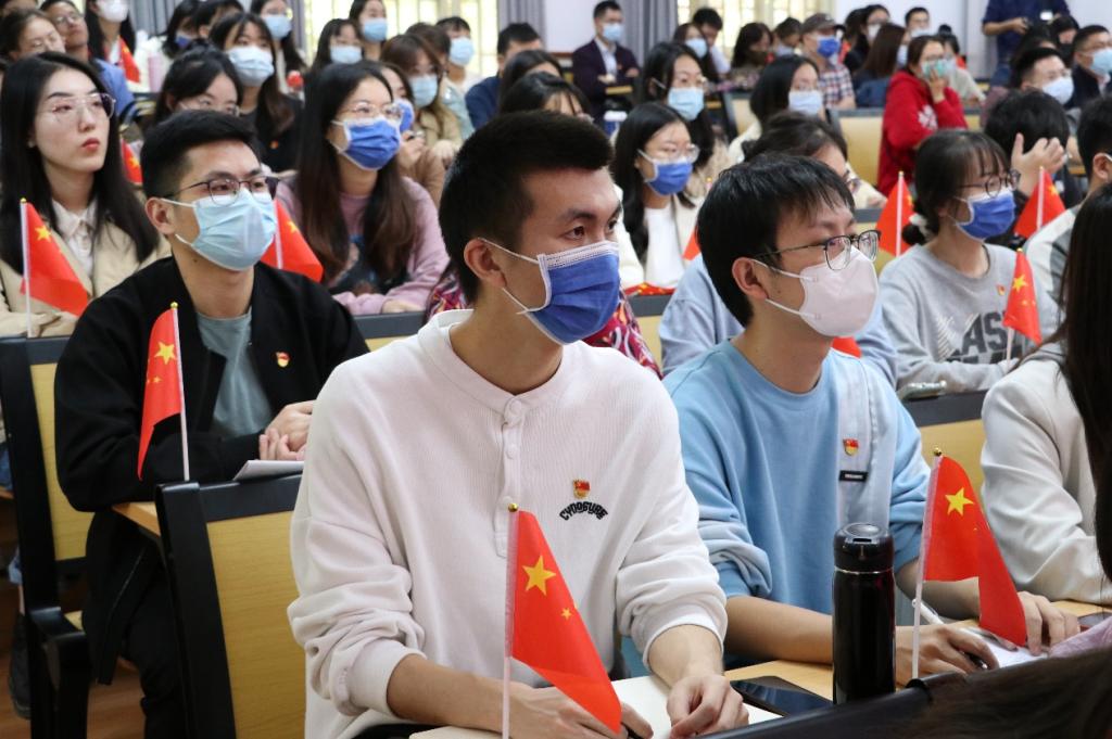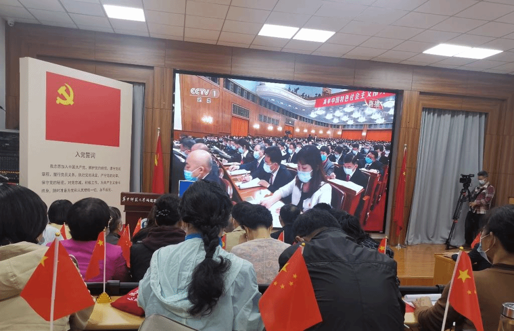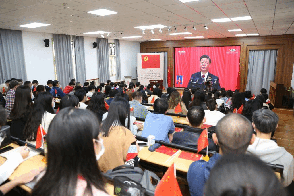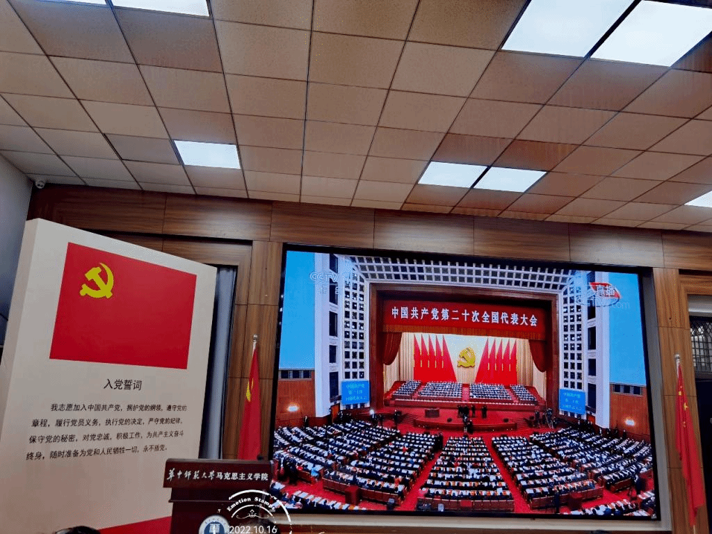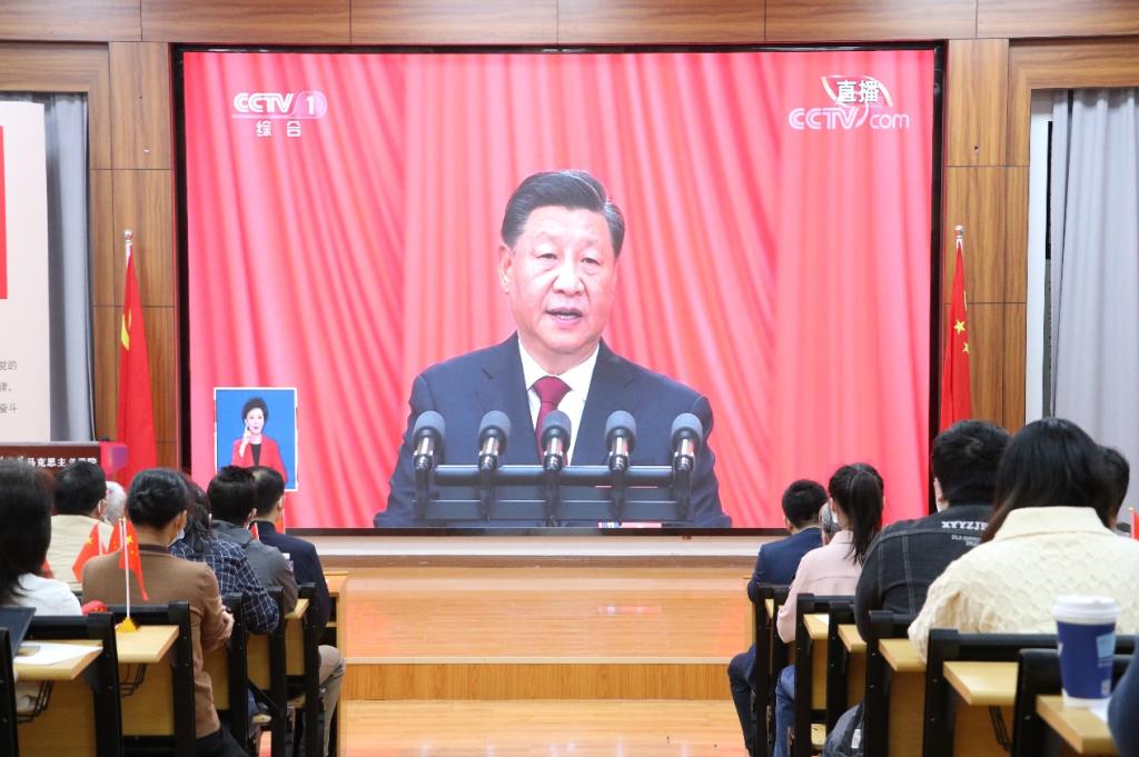 马克思主义学院讯(通讯员 石浩冉 甘文轩;摄影 黄天锡 郭台美)大道如砥,大势如潮。当历史的指针指向2022年的金秋十月,矢志复兴的中华民族,行进到关键一程的关键节点。10月16日上午,中国共产党第二十次全国代表大会在北京人民大会堂开幕,习近平总书记代表第十九届中央委员会向大会作了题为《高举中国特色社会主义伟大旗帜 为全面建设社会主义现代化国家而团结奋斗》的报告。马克思主义学院组织全院教工、退休教师代表、今年新入党党员师生等代表在一号楼1101报告厅集中收看直播盛况,并号召全院广大师生以多种形式收听收看开幕会。