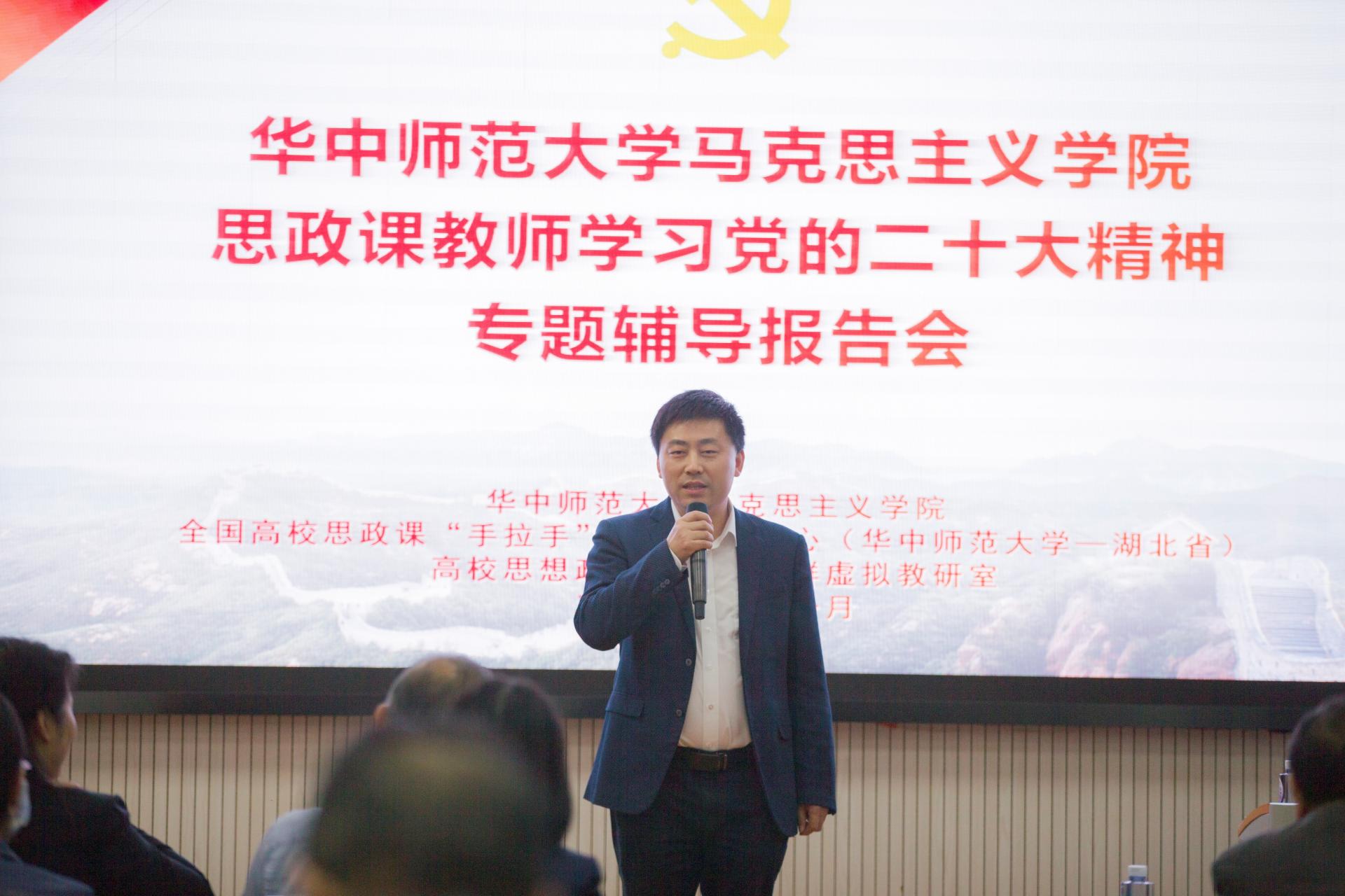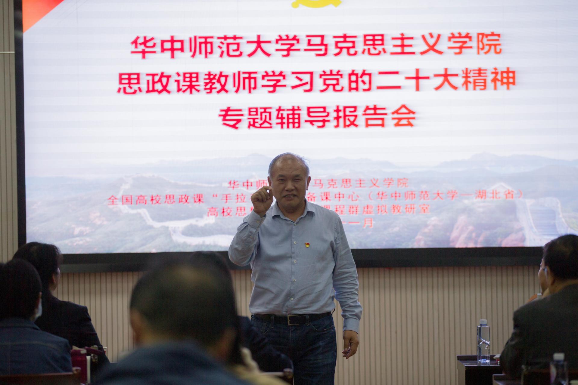 马克思主义学院讯(通讯员 陈凌继霄)党的二十大是一次高举旗帜、凝聚力量、团结奋进的大会。学习宣传贯彻好党的二十大精神,是当前和今后一个时期的首要政治任务。为让我院思政课教师悟透讲准党的二十大精神,及时推进党的二十大精神进课程、进学生头脑,11月12日,马克思主义学院在一号楼1101报告厅举办思政课教师学习党的二十大精神专题辅导报告会。邀请湖北省社会科学界联合会党组书记、常务副主席喻立平同志作专题报告。马克思主义学院党委书记孙永祥主持报告会。马克思主义学院院长万美容、副院长李芳,以及全体思政课教师和部分承担思政课教学任务的专业课教师参加报告会。
