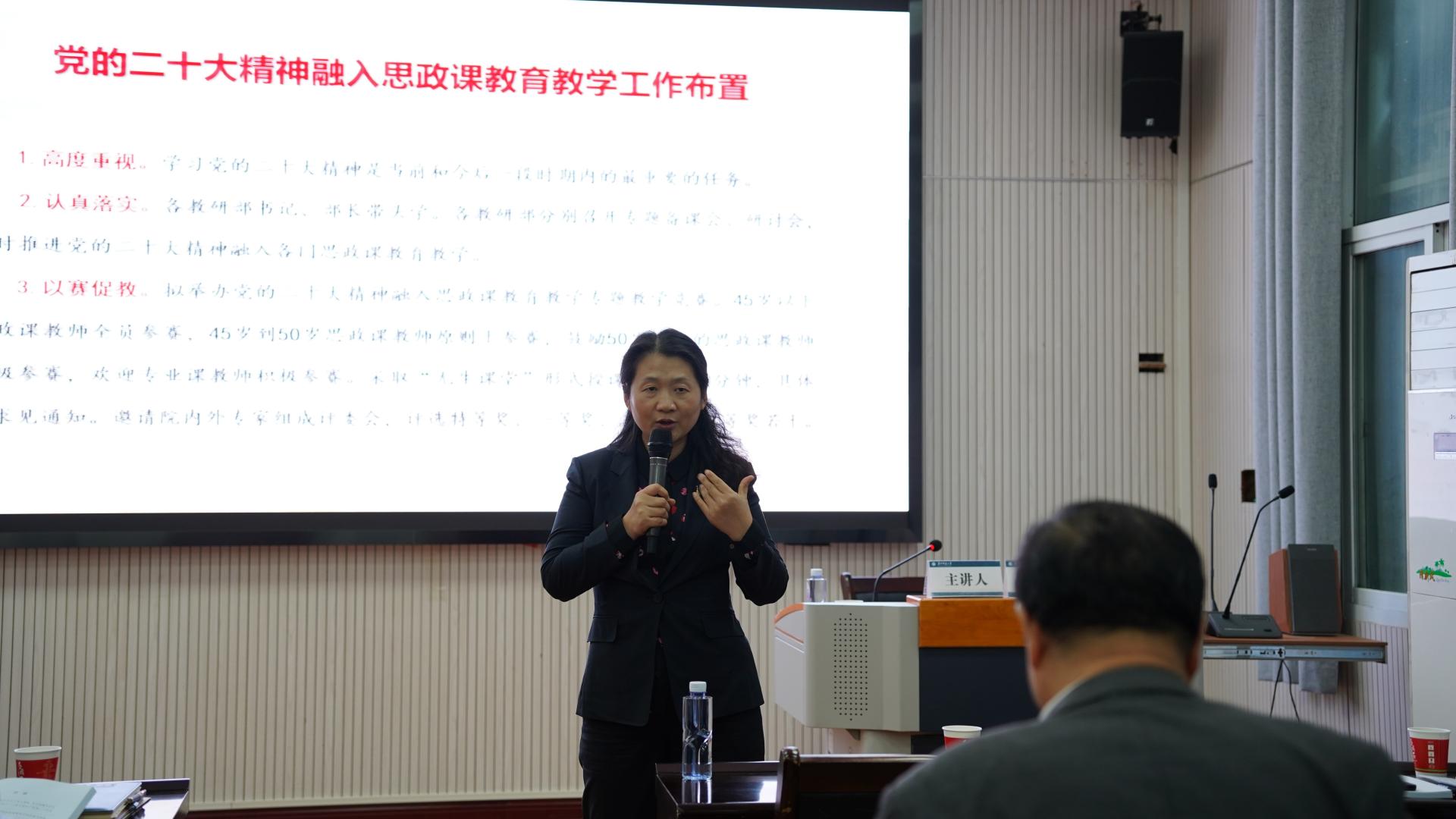 李芳副院长对党的二十大精神融入思政课教育教学工作进行了布置。一是高度重视,学习宣传贯彻好党的二十大精神,是当前和今后一个时期的首要政治任务。二是认真落实,各教研部书记、部长带头学,各教研部分别召开专题备课会、研讨会,及时推进党的二十大精神融入各门思政课教育教学。三是以赛促教,学院拟举办党的二十大精神融入思政课教育教学专题教学竞赛。
