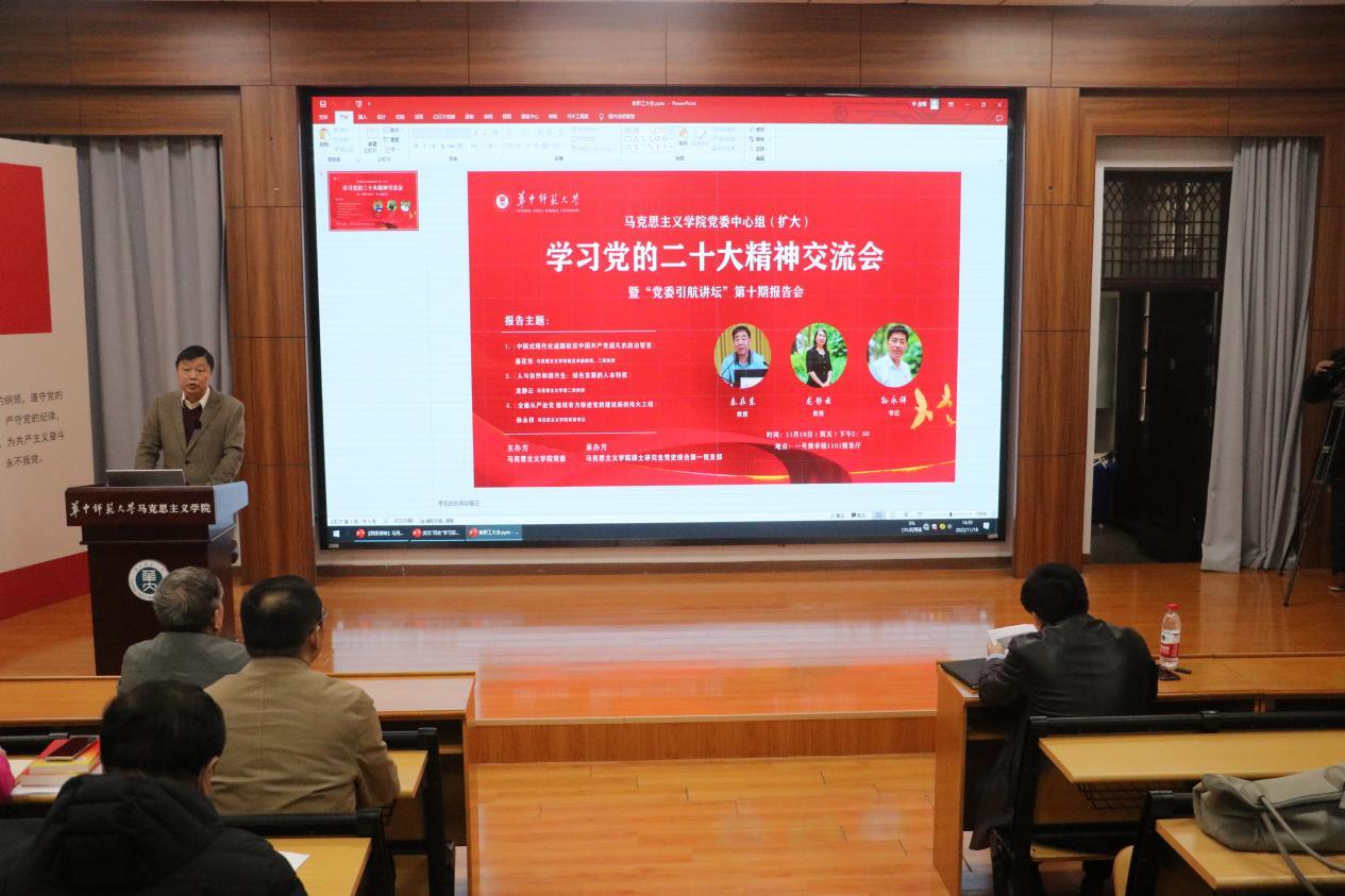 马克思主义学院讯(通讯员 喻煦云;摄影 李晓娜 皮久驰)11月18日,马克思主义学院党委中心组(扩大)学习党的二十大精神交流会暨“党委引航讲坛”第十期报告会在一号教学楼1101报告厅顺利举行。马克思主义学院全体教职工、硕士研究生党史综合第一党支部及党史综合2021级党支部、2022级党支部学生党员参加会议。会议由学院正处职组织员董俊敏主持。