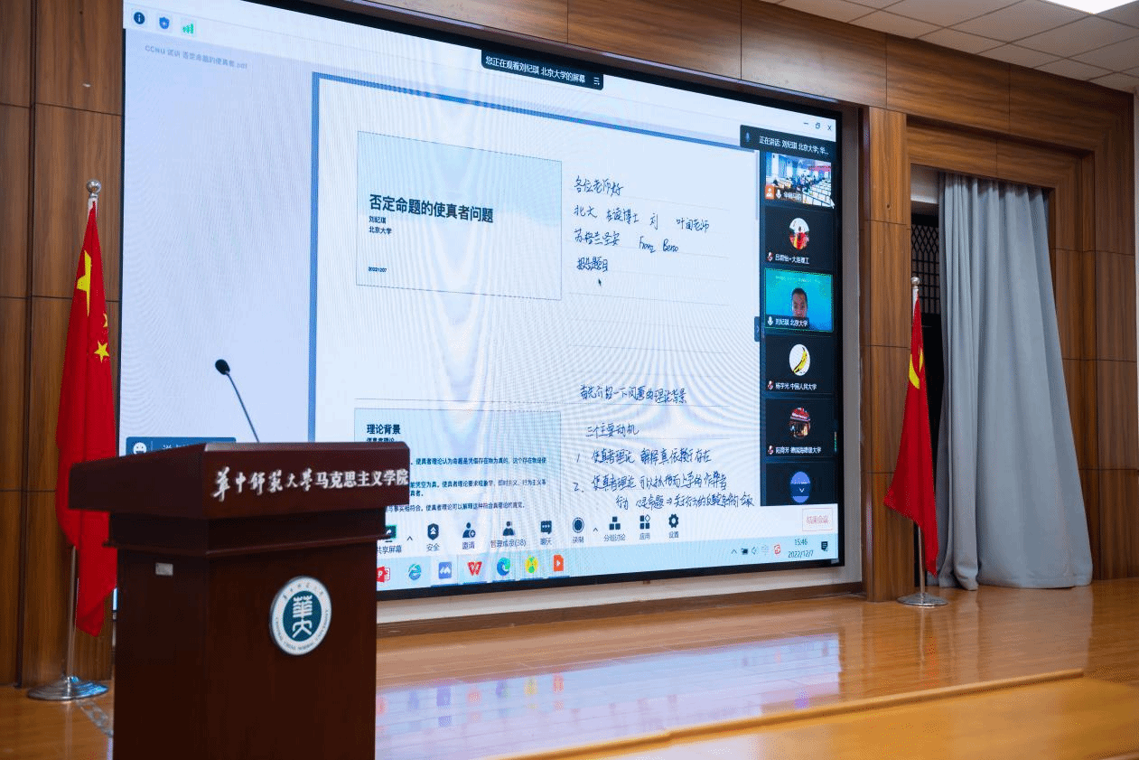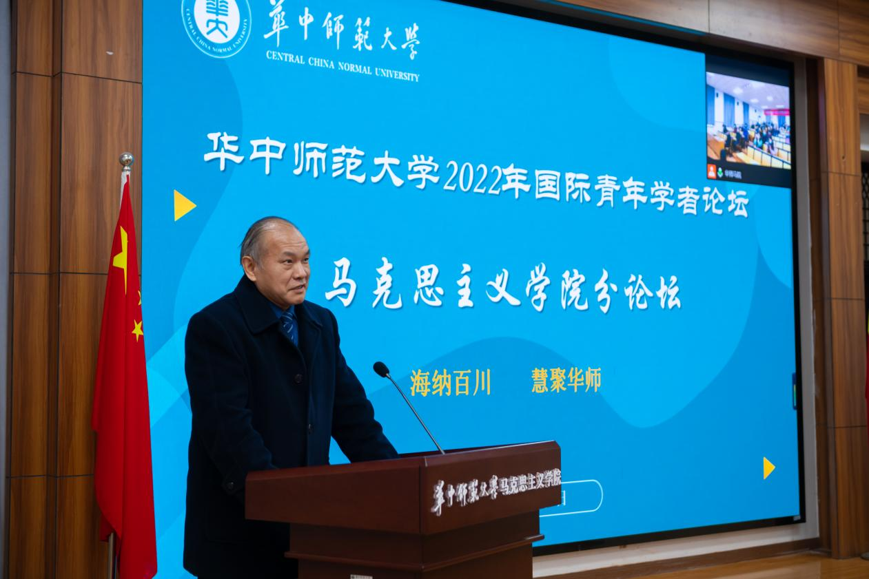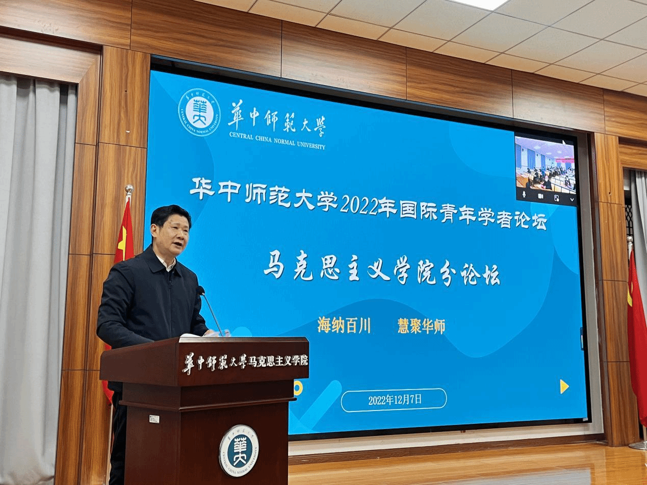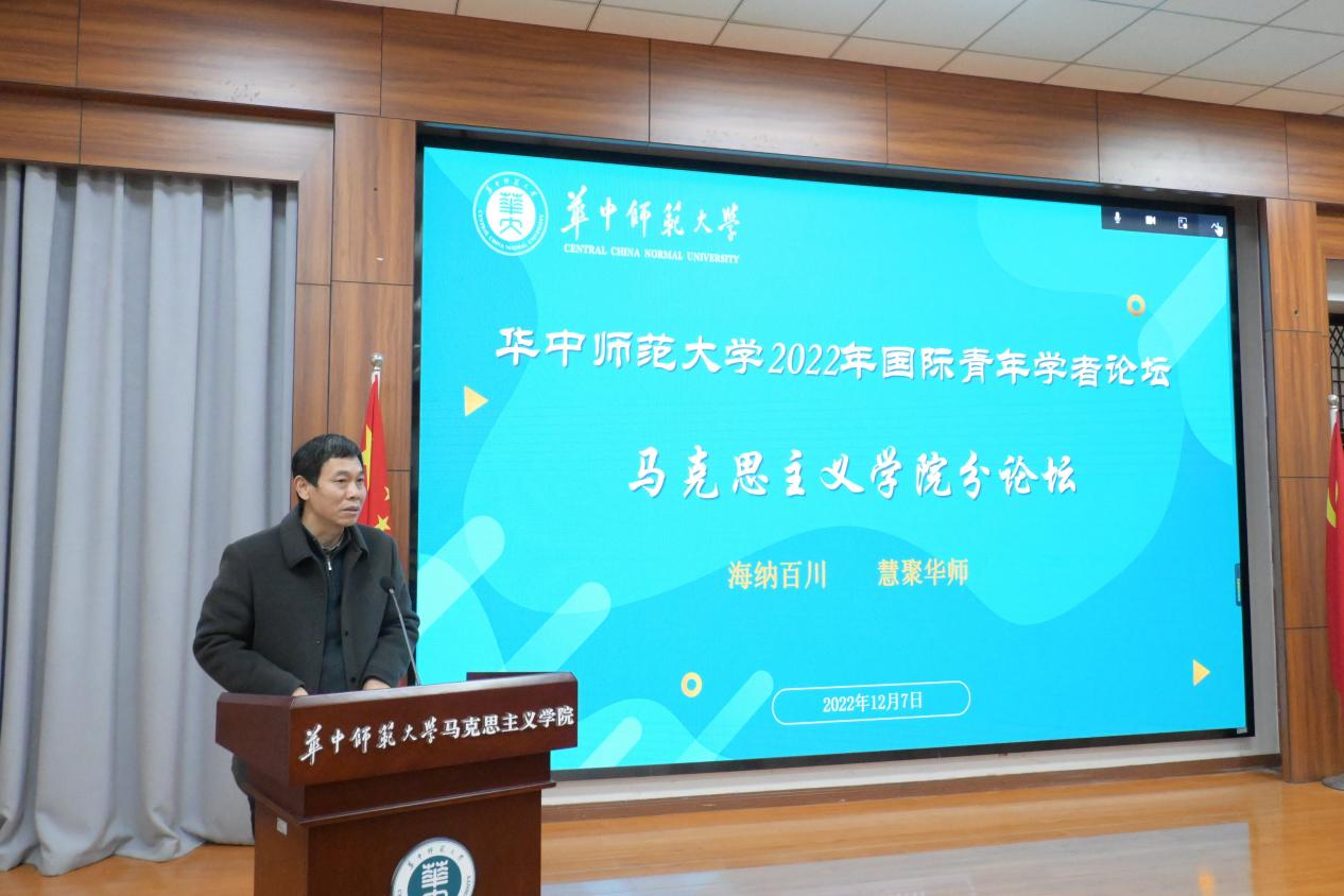 马克思主义学院讯(通讯员 赵婷;摄影 陈希昌 何慕恬)为推进学术创新与交流合作,加强人才队伍建设,12月7日,华中师范大学2022年国际青年学者论坛马克思主义学院分论坛在马克思主义学院一号楼1101报告厅隆重开幕。校党委书记赵凌云、副校长李鸿飞出席,人事部相关负责人和马克思主义学院部分师生参加。来自澳大利亚悉尼大学、法国巴黎高等师范学院、德国海德堡大学、北京大学、中国人民大学、武汉大学、大连理工大学、华中师范大学等9名博士青年学者以线上线下相结合的方式参加,论坛以网络直播方式进行,吸引众多青年学子参会。报告会由华中师范大学马克思主义学院院长万美容主持,交流环节由马克思主义学院副院长毛华兵主持。