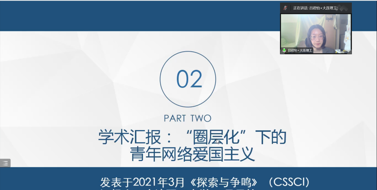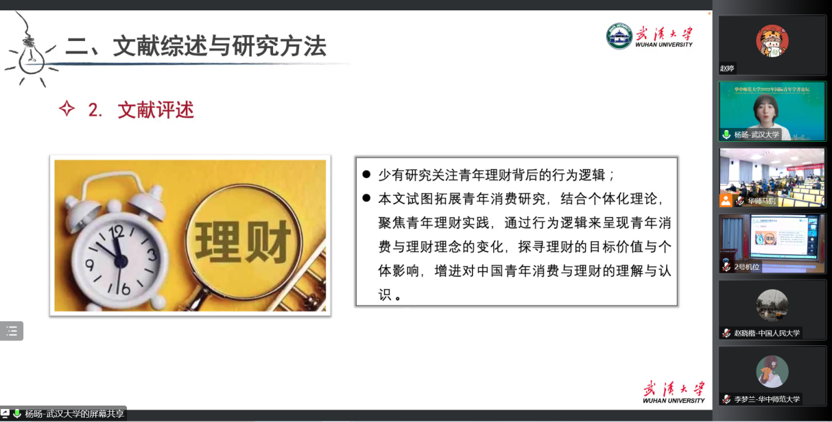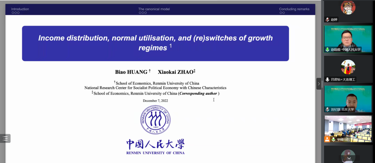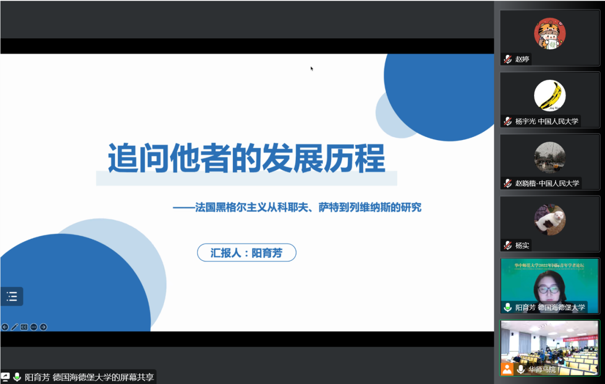 在论坛主题报告环节,9位来自国内外高校的青年学者依次作报告。武汉大学的杨旸博士以《个体化视角下青年理财的生活策略与价值追求》为主题,从理财意识、理财价值及理财焦虑三个方面进行剖析,展现了青年理财的价值追求与现实困境;华中师范大学的李梦兰博士以《新时代中国特色乡村治理信息化效能研究》为主题,全面分析了乡村治理信息化的实践效能、现实困境及发展路径;大连理工大学的吕君怡博士以《“圈层化”下的青年网络爱国主义》为主题,阐明了“圈层化”下青年网络爱国主义的特点、潜在危机和引导路径;中国人民大学的赵晓楷博士以《income distribution, normal utilisation, and (re)switches of growth regimes》为题,以专业且科学的研究方法对新卡莱茨基增长体制理论进行了剖析及反思;中国人民大学的杨宇光博士以《苏区经济实践与马克思主义中国化》为主题,详细阐述了苏区经济的特征与马克思主义中国化之间的关系;德国海德堡大学的阳育芳博士以《追问他者的发展历程——法国黑格尔主义从科耶夫到萨特再到列维纳斯的研究》为主题进行了汇报;法国巴黎高等师范学院的赵易博士以《从感觉运动学说到对意识理论的三个重估》为主题汇报了感觉运动学说目前的研究现状;正在英国圣安德鲁斯大学访学的北京大学刘纪琪博士围绕《否定命题的使真者问题》,以风趣幽默的例子进行了剖析阐述。毕业于澳大利亚悉尼大学的方卫副教授以《机制与机制解释》为主题,分享了机制研究进展。