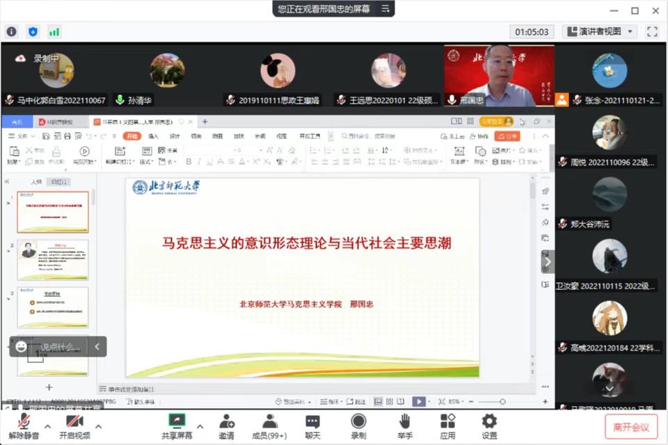 马克思主义学院讯(通讯员 高星星;摄影 郭白雪)2023年3月31日晚,由华中师范大学马克思主义学院主办的第二十三期“思政名家讲坛”在腾讯会议平台顺利举行。本次讲坛特邀北京师范大学马克思主义学院教授、博士生导师邢国忠教授主讲,主题为“马克思主义的意识形态理论与当代社会主要思潮”。华中师范大学马克思主义学院院长万美容教授出席,学校师生百余人参加讲座。