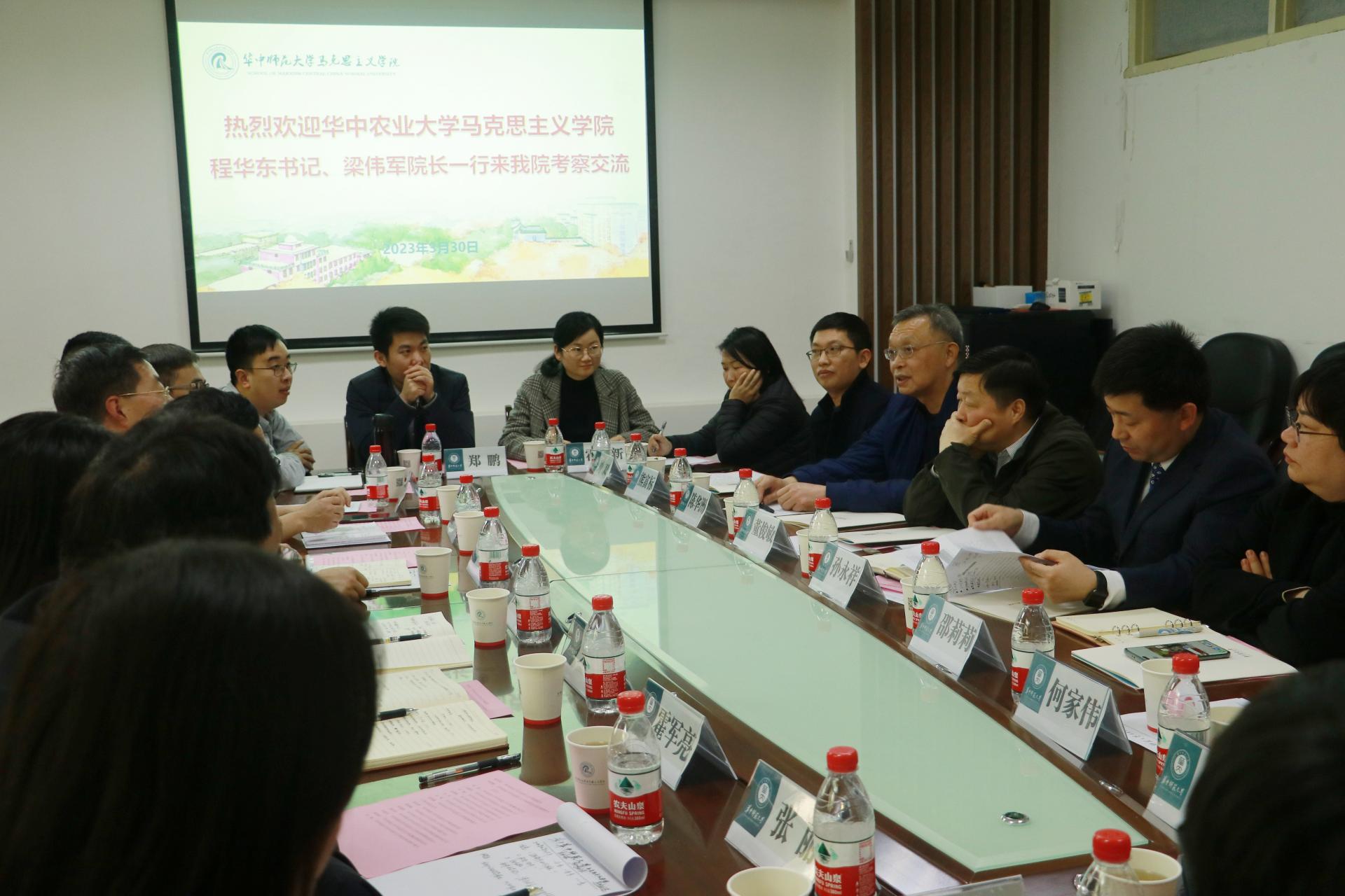马克思主义学院讯(通讯员 席雨欣;摄影 王书苑)3月30日,华中农业大学马克思主义学院党委书记程华东、院长梁伟军、学院党委副书记吴珊、副院长胡丰顺及全体教研室主任等一行来我院调研交流。我院党委书记孙永祥、正处职组织员董俊敏、党委副书记邵莉莉、思政系主任陈华洲、“纲要”教研部部长何家伟、“概论”教研部部长熊富标、思政课教务办主任闫燕等参加本次座谈会。双方就学院建设发展情况、思政课建设情况、科学研究与人才培养有关情况和党建工作情况等作了深入交流。