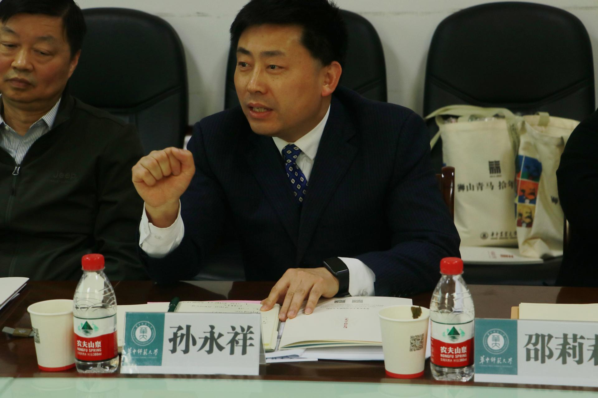 孙永祥对华中农业大学程华东书记带队一行的到来表示热烈的欢迎,并结合调研主题,介绍我院工作建设,对如何完善教师评价改革、争创新一轮“一流”学科建设、推进一流本科专业建设等进行了分享。重点围绕思政课建设工作谈了一些体会,强调要有高的站位,加强“第一学院、第一学科、第一课程”建设,学校党委重视是关键,强调以队伍建设为保障,以集体备课会为抓手,以教学竞赛为牵引,以基地平台建设为支撑,以学生获得感为目标,全面推进思政课建设工作。