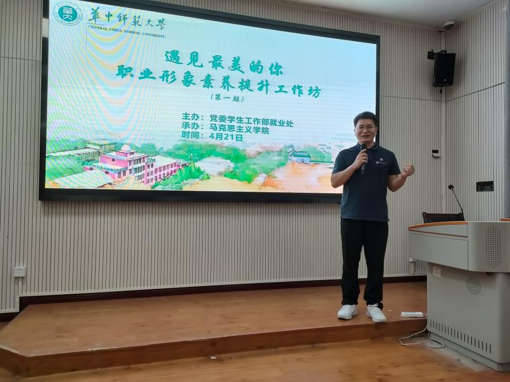 马克思主义学院讯(通讯员 宋天骐)为积极引导和加强全体在校学生学习求职知识、训练求职技能,有效提升学生的就业竞争力,华中师范大学就业处联合马克思主义学院举办职业形象素养提升工作坊。4月21日,马克思主义学院举办第一期职业形象素养提升工作坊,邀请我校《礼仪与修养》课程主讲老师李艳,以 “树良好形象,赢未来职场”为主题开展职场形象塑造讲座。活动在一号楼三楼报告厅举办,由院团委书记赵云逸主持。