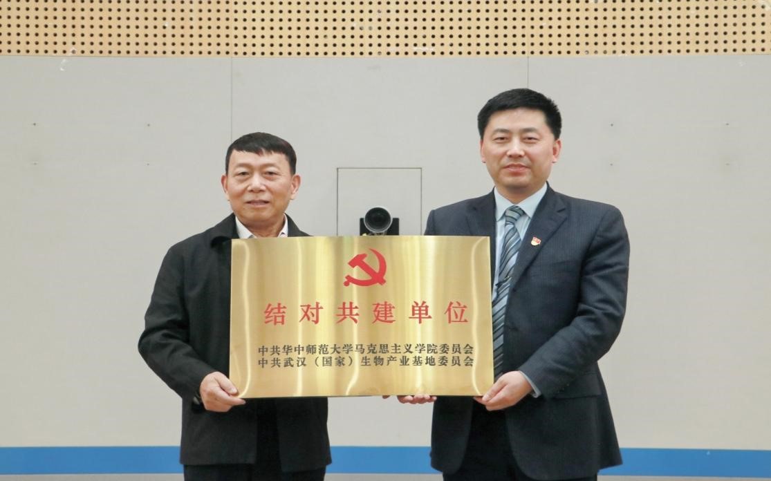 孙永祥和李敦强在联合共建协议上签字。华中师范大克思主义学院党委书记孙永祥、院长万美容、思想道德与法治教硏部党支部书记徐秉国等受聘为中共武汉国家生物产业基地综合党委特聘教授。