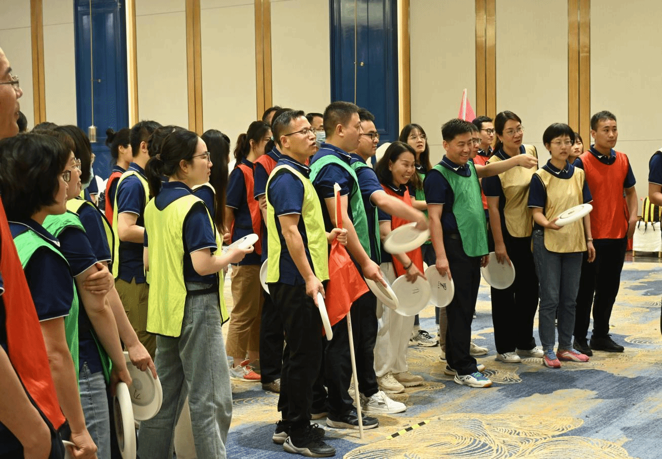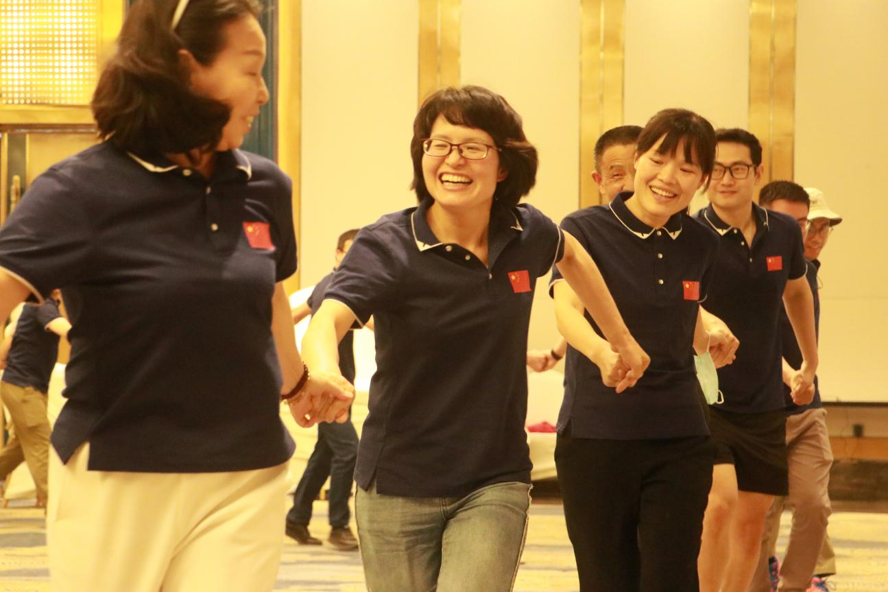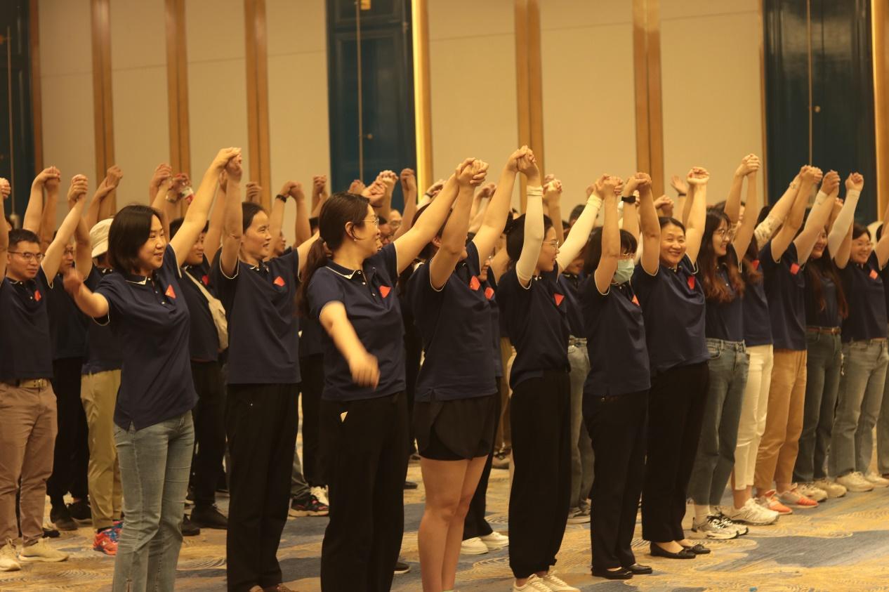 随后,教练带领大家展开今天的项目。趣味运动会共分为热身运动、团队比赛两个环节。在热身运动“穿过爱心之门”中,教职工们互相牵着手,成一条线围绕场地转圈,两名教职工用双手搭乘爱心之门,其他人从底下穿过后,再组建搭成另一个爱心之门。整齐划一的手势,搭建起前方的爱心通道;紧紧握住的双手,凝聚着团结一心的力量。