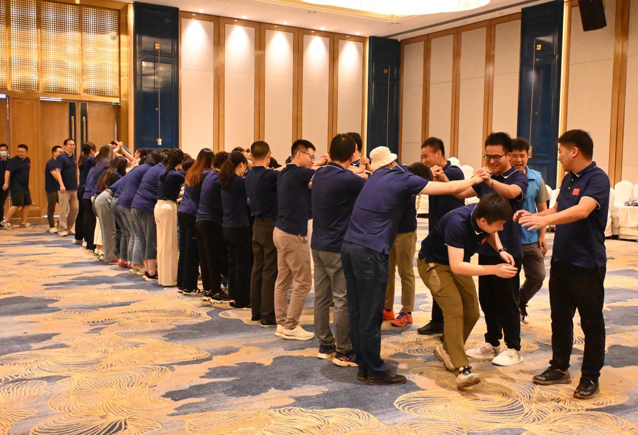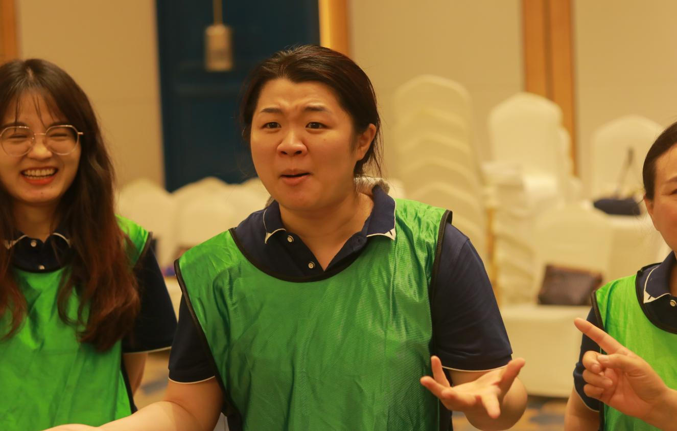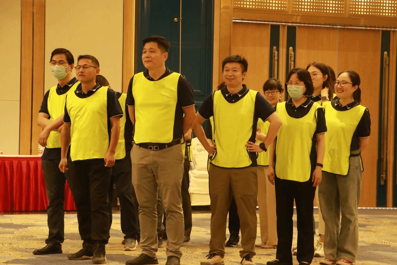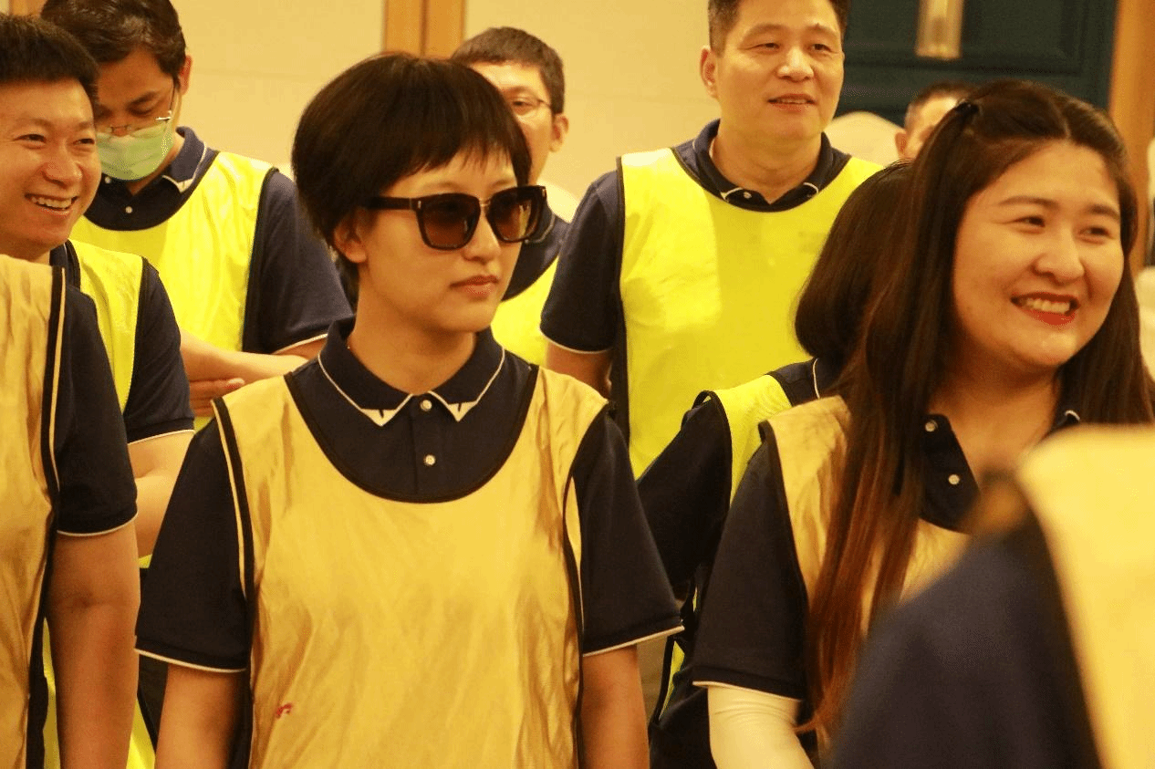 随后,教练带领大家展开今天的项目。趣味运动会共分为热身运动、团队比赛两个环节。在热身运动“穿过爱心之门”中,教职工们互相牵着手,成一条线围绕场地转圈,两名教职工用双手搭乘爱心之门,其他人从底下穿过后,再组建搭成另一个爱心之门。整齐划一的手势,搭建起前方的爱心通道;紧紧握住的双手,凝聚着团结一心的力量。