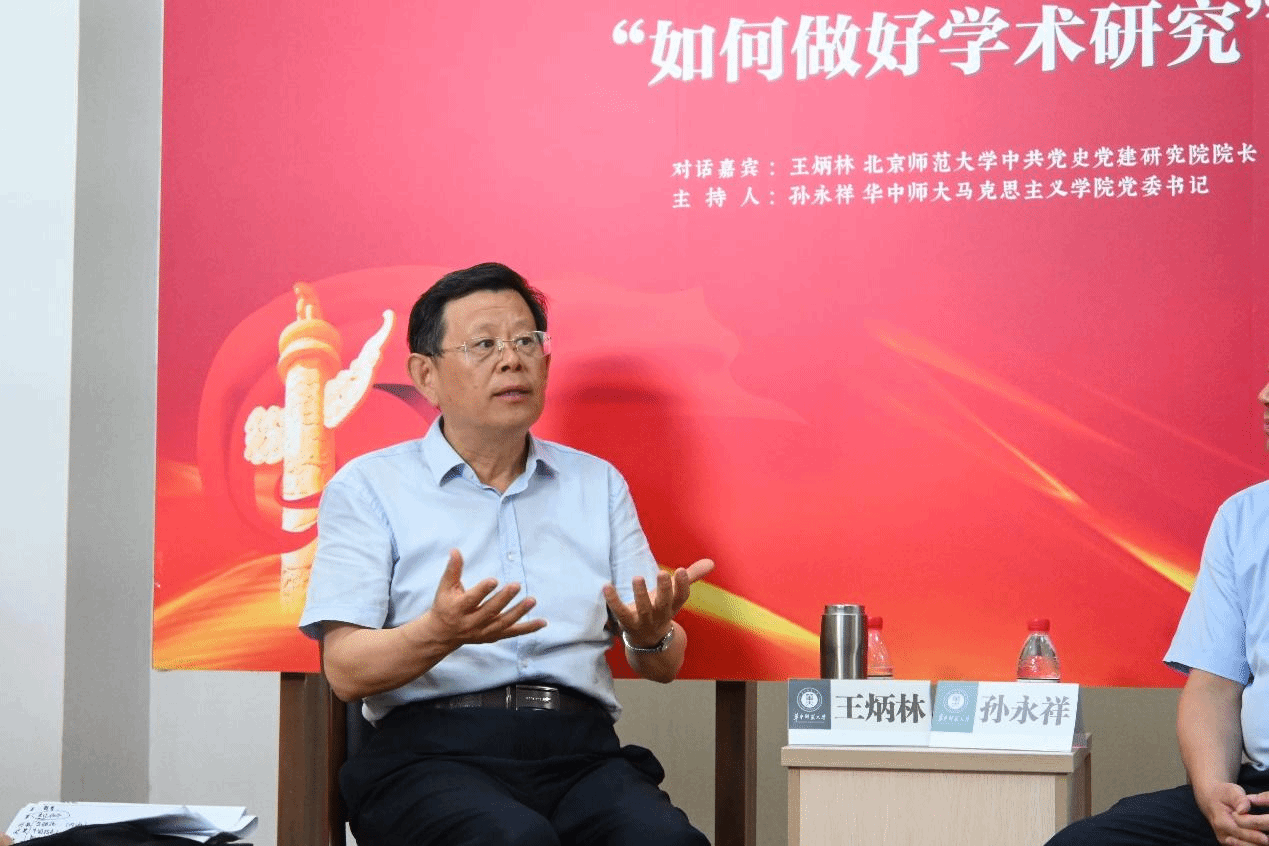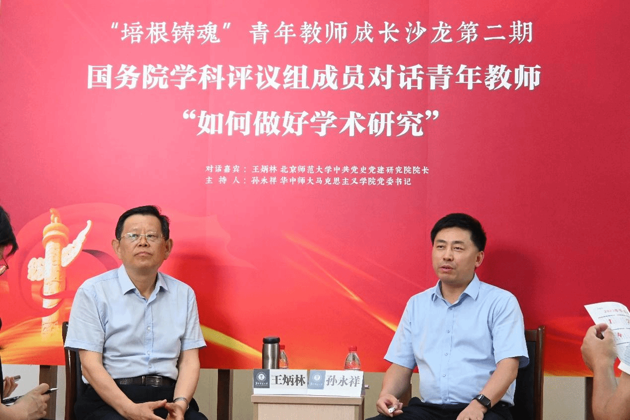 马克思主义学院讯(通讯员 徐艳艳;摄影 何慕恬)6月8日,华中师范大学马克思主义学院“培根铸魂”青年教师成长沙龙第二期暨国务院学位委员会学科评议组成员对话青年教师“如何做好学术研究”在一号楼217工作室顺利举行。对话嘉宾是来自北京师范大学中共党史党建研究院院长、华中师范大学特聘教授、国务院学科评议组成员王炳林教授,主持人由华中师范大学马克思主义学院党委书记孙永祥担任。