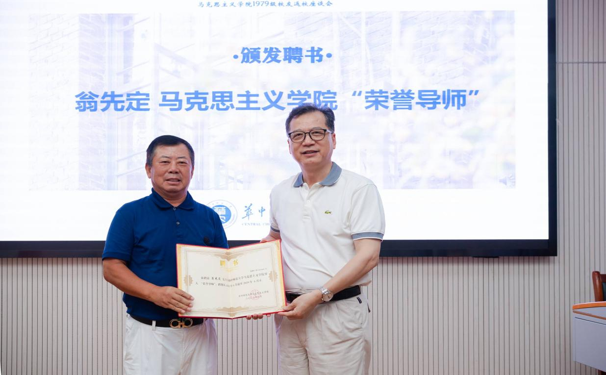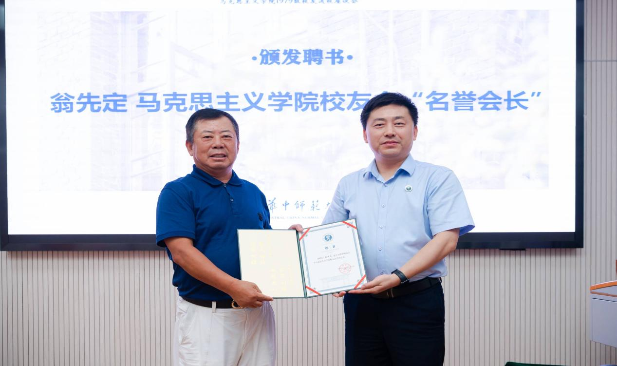 (马克思主义学院党委书记孙永祥为翁先定校友颁发学院校友会“名誉会长”聘书)