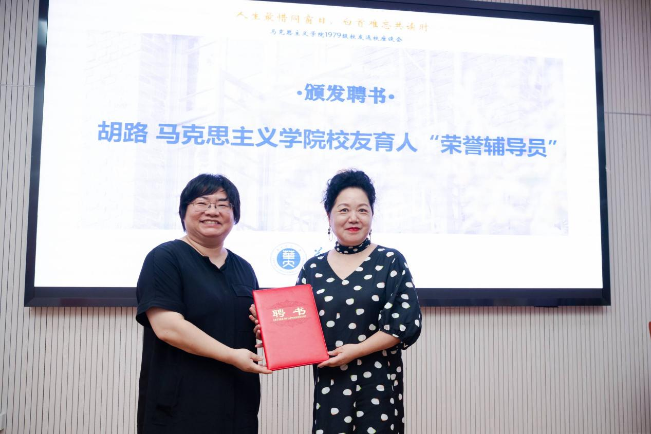 (马克思主义学院党委副书记邵莉莉为胡路校友颁发校友育人“荣誉辅导员”聘书)