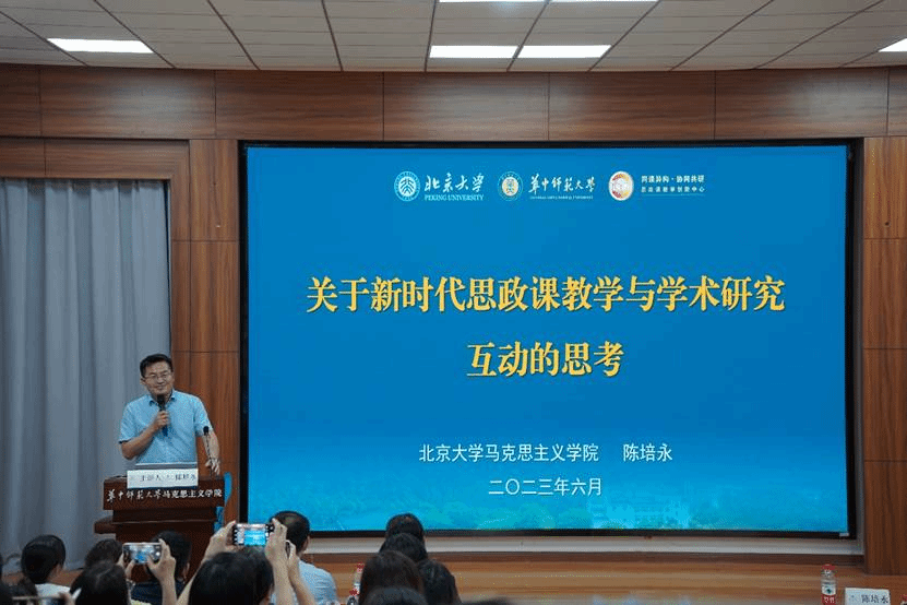 马克思主义学院讯(通讯员 骆贺敏)为深入学习贯彻党的二十大精神,深入推进学习贯彻习近平新时代中国特色社会主义思想主题教育,切实提升思政课教师教学和科研能力,6月20日下午,全国高校思政课“手拉手”集体备课中心(华中师范大学—湖北省)、高校思想政治理论课程群虚拟教研室(华中师范大学)、“同课异构·协同共研”思政课教学创新联盟秘书处、华中师范大学马克思主义学院在一号楼1101教室举办“新时代思政课教学与学术研究良性互动研究”备课会。北京大学马克思主义学院副院长陈培永教授现场指导备课,来自空军预警学院、中南财经政法大学等50余所高校马克思主义学院(思政课部)教师代表参加会议。备课会由华中师范大学马克思主义学院副院长李芳教授主持。