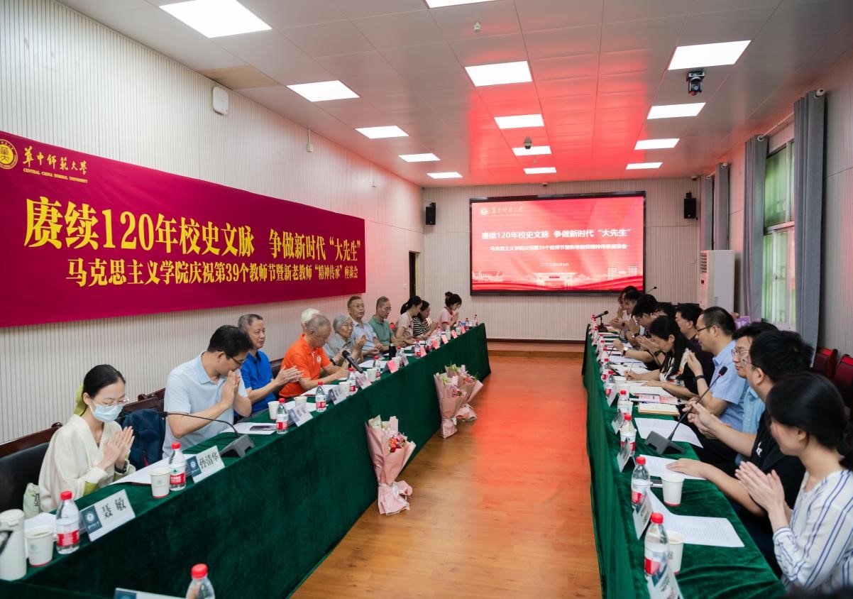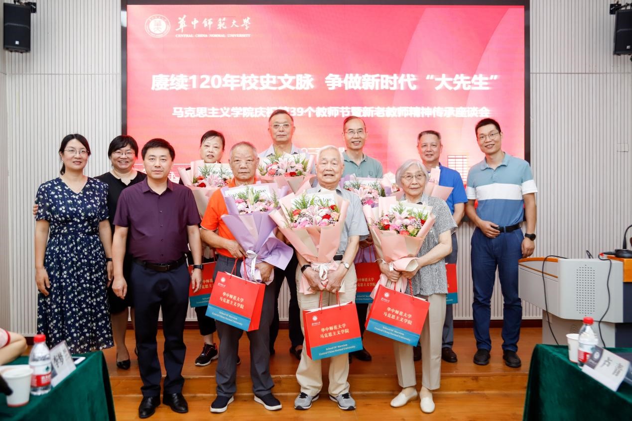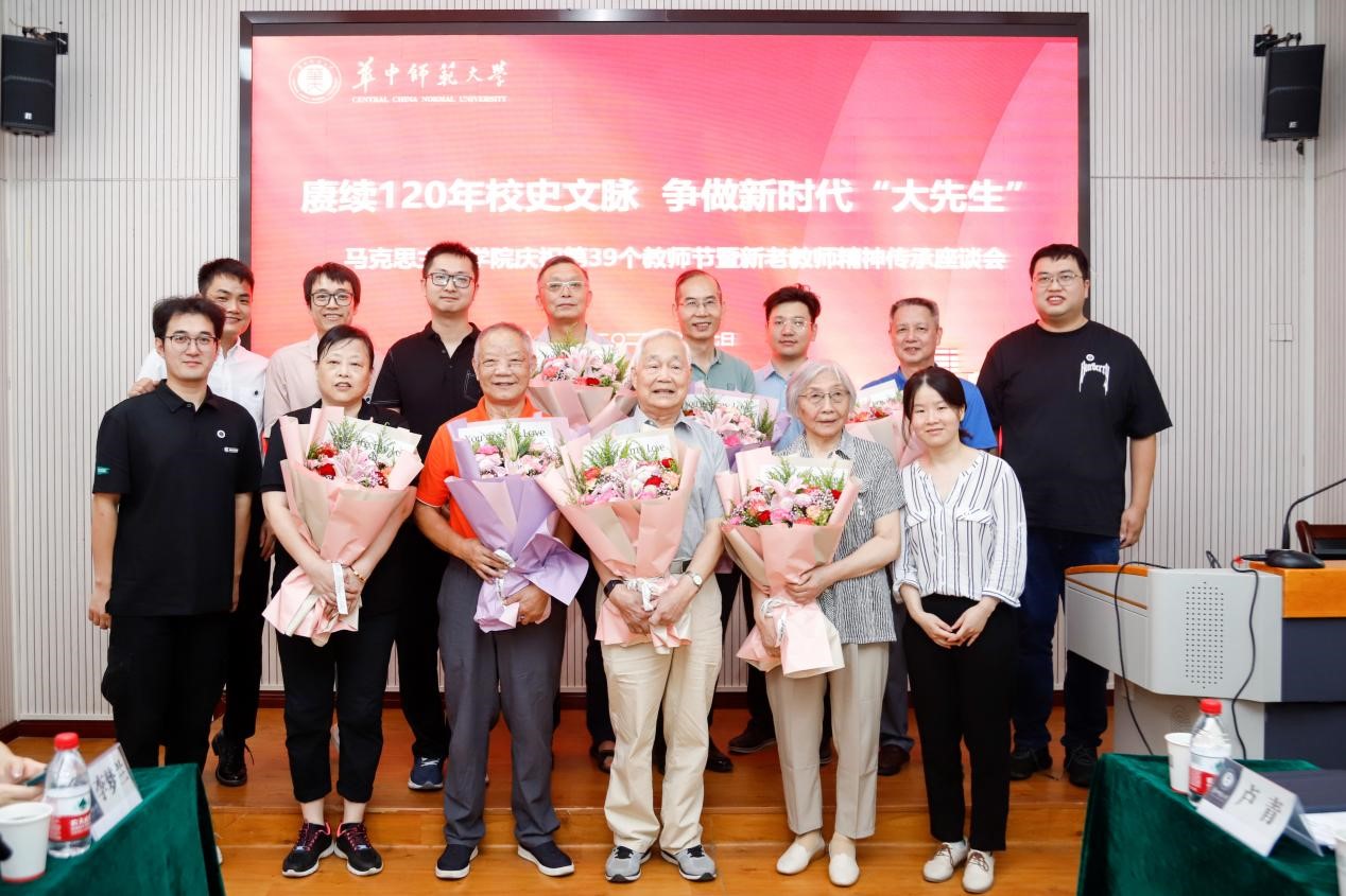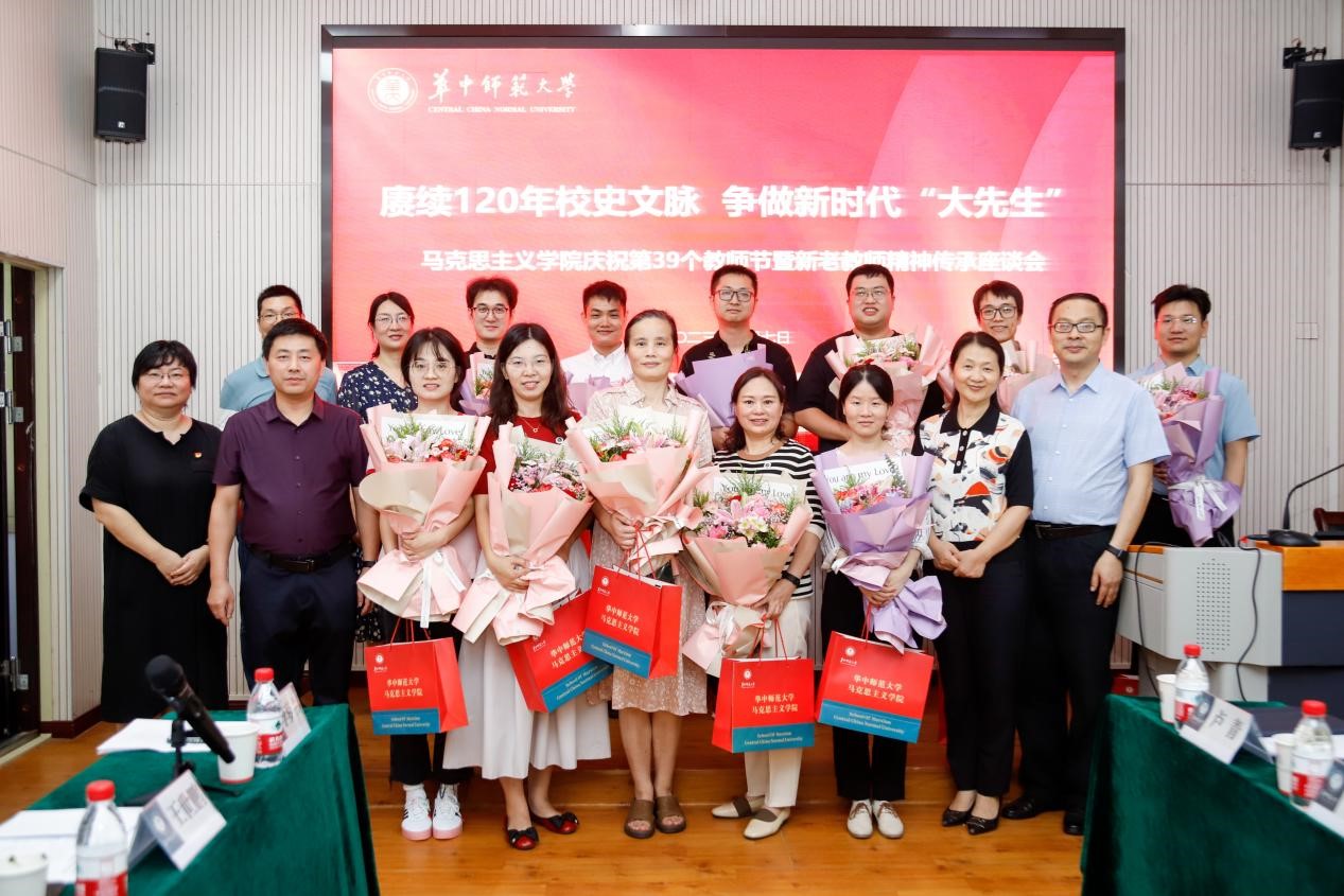马克思主义学院讯(通讯员 甘文轩;摄影 陈希昌 喻煦云)9月7日,华中师范大学1号教学楼三楼学术报告厅洋溢着节日的喜悦,“赓续120年校史文脉,争做新时代‘大先生’:马克思主义学院庆祝第39个教师节暨新老教师精神传承座谈会” 在这里举行。60后教授陈华洲发言时站起来向在场的“80后”“70后”老教授鞠躬致谢,70后董小红副教授发言时也站起来向在场的“80后”“70后”和60后教授鞠躬致谢;老教师为新入职教师佩戴校徽,学院领导为新入职教师献花......一场围绕“大先生”的研讨,一次“精神传承”的接力正在这里进行。