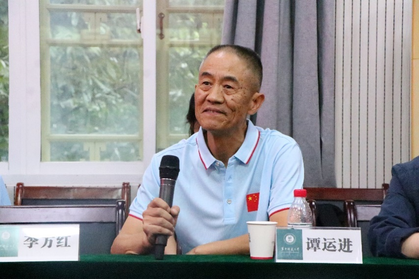1979级校友谭运进表达了对三位教师、母校和1979级同学们的感谢,并对翁先定校友的高尚情怀表达了自己的敬意。他认为翁先定校友是一位有知识、有思想、有担当、有品德的成功企业家,翁先定校友这种教育强国情怀和企业家社会担当精神,值得我们崇敬与学习。