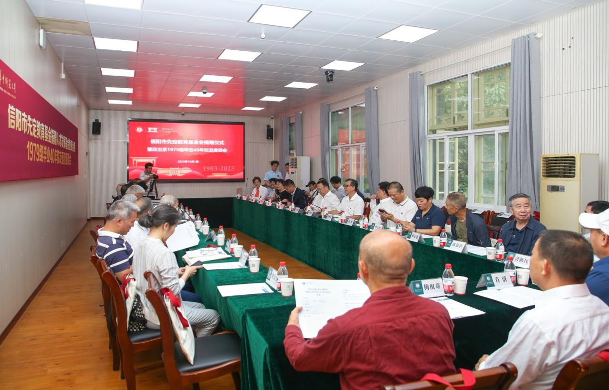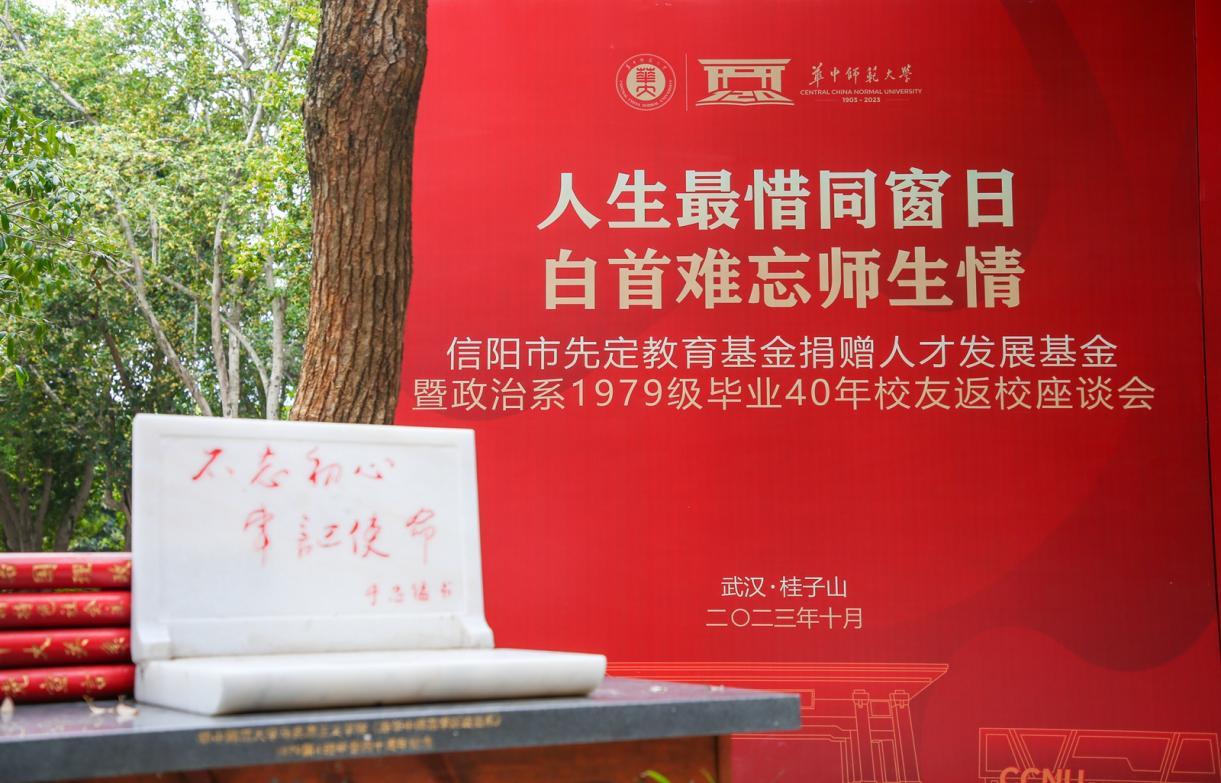 马克思主义学院讯(通讯员 陈文欣 伊利亚尔;摄影 郭台美 蒋林杉 李佳仪)10月1日,信阳市先定教育基金会捐赠仪式暨马克思主义学院(原政治系)1979级毕业40年校友座谈会在马克思主义学院三楼学术报告厅举行。华中师范大学马克思主义学院(原政治系)1979级校友、新产业投资股份有限公司董事长兼总裁翁先定,信阳市先定教育基金会副理事长陈净,1979级校友、华中师范大学爱心大使胡路,校党委书记夏立新,副校长彭南生等出席。相关职能部门和学院主要负责人及时任教师代表、马克思主义学院(原政治系)1979级返校校友等参会。本次活动由马克思主义学院党委副书记邵莉莉主持。