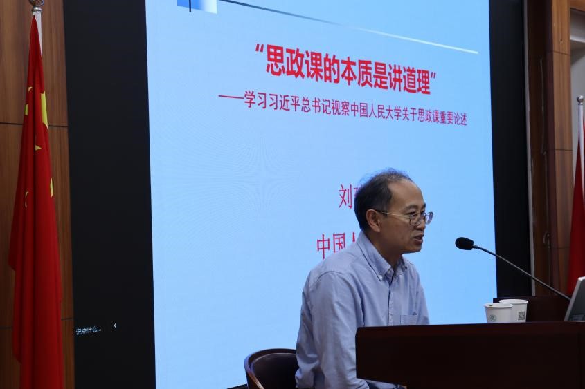 讲座伊始,刘建军教授简要介绍了习近平总书记视察中国人民大学的一系列活动。接下来,刘建军教授对习近平总书记视察中国人民大学讲话的相关要点作了阐述。之后,刘建军老师引用了习近平总书记“关于思政课的本质是讲道理”的讲话,并对此进行了系统地阐释,结合现实案例,深入浅出向在座师生表达了自己的见解。