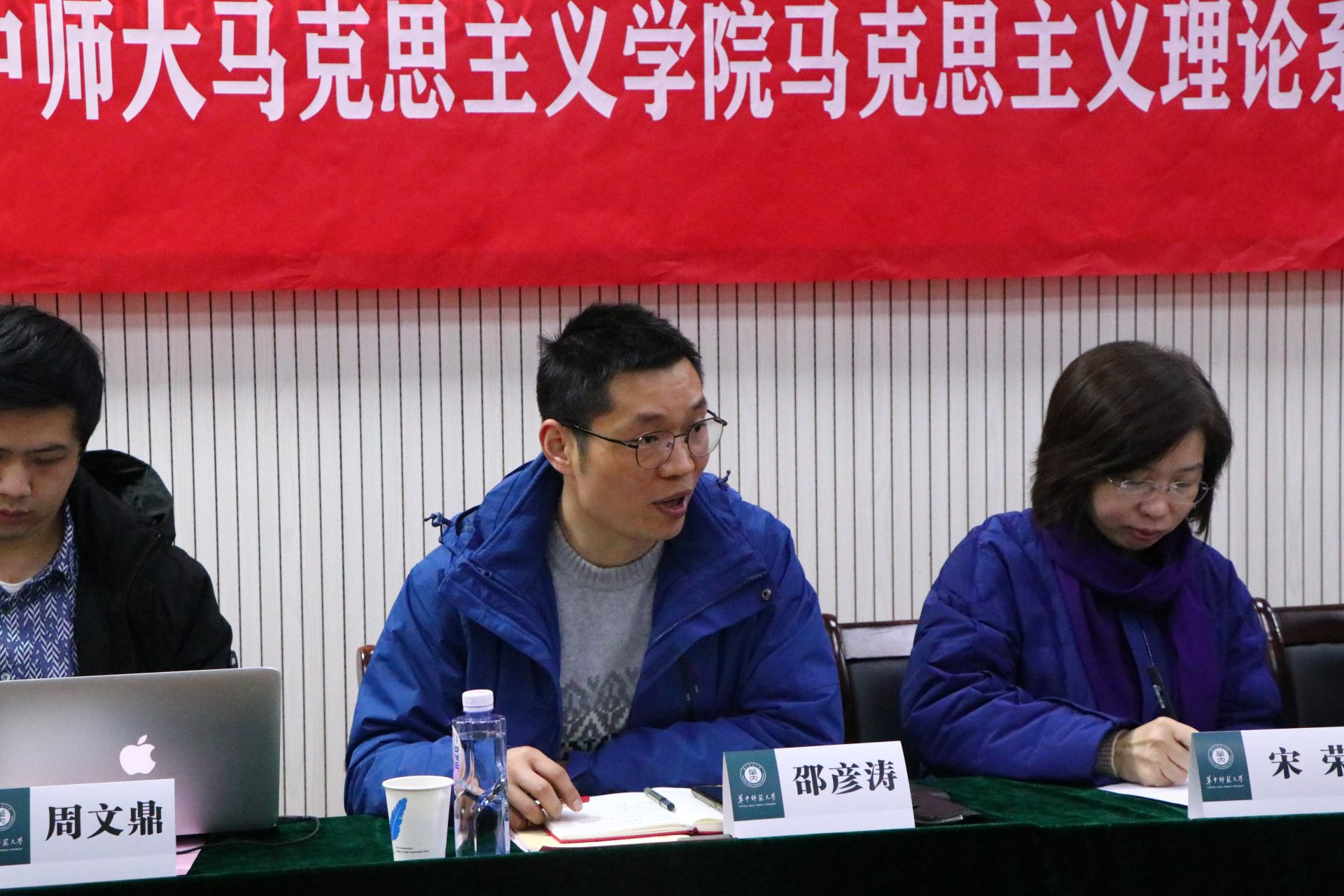 马克思主义学院讯(通讯员 黄诗瑜;摄影 张梦婷)为深入推进思政课程与课程思政同向同行、协同育人,由华中师范大学“课程思政教学研究中心协同创新联盟”举办的课程思政建设集体备课会第三期于11月30日在马院三楼学术报告厅顺利开展。出席本次活动的嘉宾有我校新闻传播学院陈科副教授、外国语学院向宗平副教授、武汉职业技术学院聂钟鸣副教授、武汉中学政治教师何虞清、武汉市第十四中学英语教师朱敏、《教师教育论坛》编辑部主任周文鼎、马克思主义学院宋荣教授以及马克思主义学院青年教师、学生代表等。会议由马克思主义学院副院长邵彦涛主持。