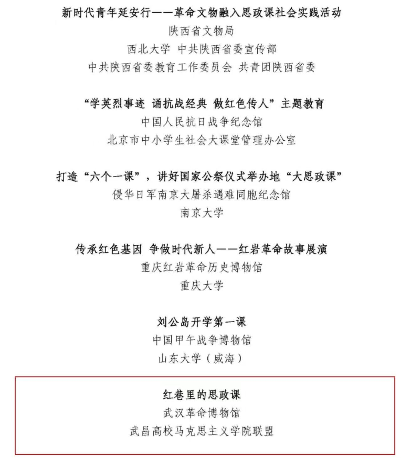 马克思主义学院讯(通讯员 闫燕)11月27日,全国大中小学思想政治教育一体化战略研讨会在上海召开。会上,教育部、国家文物局共同发布以革命文物为主题的“大思政课”优质资源项目,我校作为重要成员参与的武昌高校马克思主义学院联盟与武汉革命博物馆创新打造的“红巷里的思政课”被评为优质资源示范项目,是此次入选的全国10个示范项目之一。