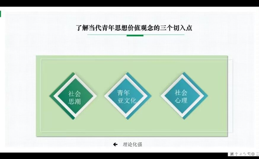 刘亚琼老师强调可从社会思潮、青年亚文化以及社会心理等三个视角剖析当代青年的思想价值观念。她以历史虚无主义为例,辨析和批判了当前青年群体中常见的错误思潮;以躺平现象为例,深入剖析了青年亚文化现象的现实样态、生成机理和引导对策;以实证调研数据为依据,透过“天然红、反内卷、社恐、惜命、上头”等当前青年群体中流行度较高的话语探讨了青年的社会心态,阐释了教育对策。