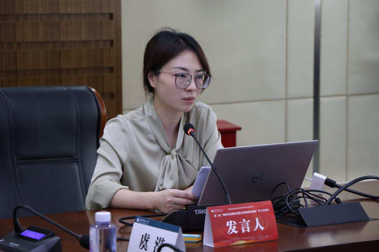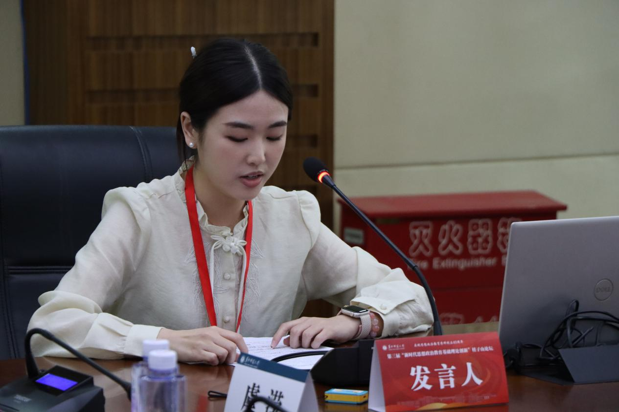 陕西师范大学吴欢带来题为《中国共产党百年思想政治教育经验启示》的发言。她首先简要地介绍了陕西师大的思想政治教育学科的建设和发展,在此基础上抒发了一些自己的思考。她强调思想政治教育学科的演进研究的四个阶段,详细介绍了四个阶段的经验和启示。她站在一名思政课教师的立场上,提出思政课教学要站在人本的价值立场,注意内容的与时俱进和理论联系实际的教学方式,同时要坚持问题导向,回顾历史,瞻前顾后,总结经验和启示。